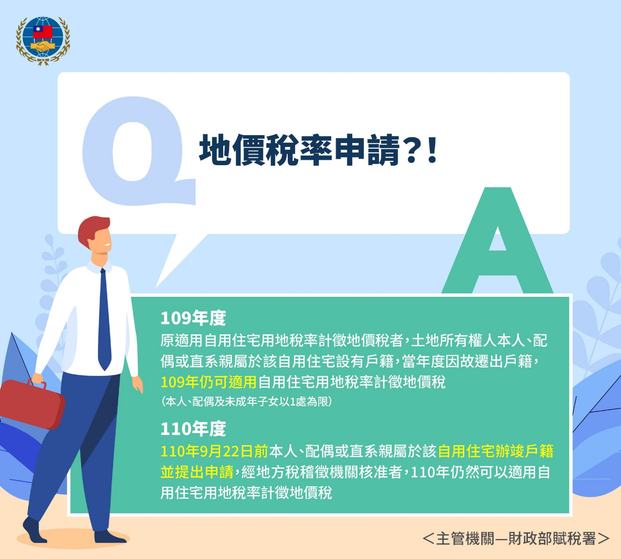 2020年度若因故遷出戶籍,當年度得適用自用住宅用地稅率計徵地價稅(本人、配偶及未成年子女以1處為限);2021年度如於9月22日前本人、配偶或直系親屬辦竣戶籍並提出申請,經地方稅稽徵機關核准者,仍可適用自用住宅用地稅率計徵地價稅。
