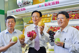 Picture 5: Changhua County Magistrate Cho Po-yuan, center, promotes his county’s fruit at a chain store in Shanghai in 2011. (Photo Courtesy of Changhua County Government)