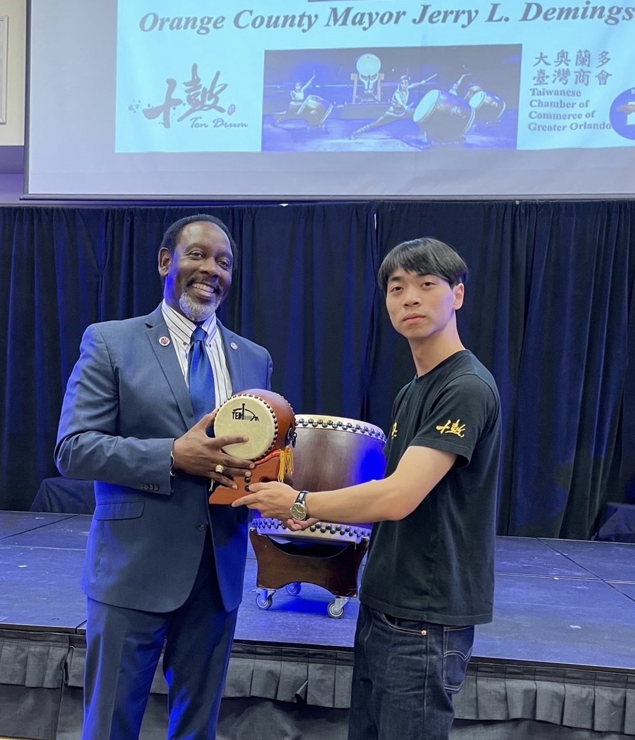 Mayor Demings presented a certificate, acknowledging the Greater Orlando Taiwanese Chamber of Commerce's contribution to promoting economic development in Orange County. He praised the performance of the Ten Drum Art Percussion Group, which added to the climax of the annual Asian Pacific American Heritage Month activities.