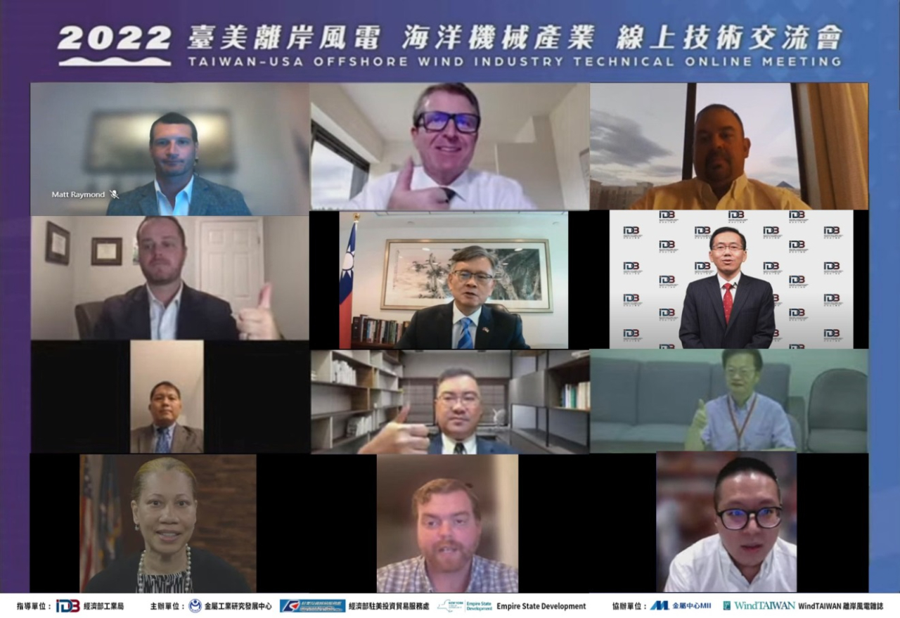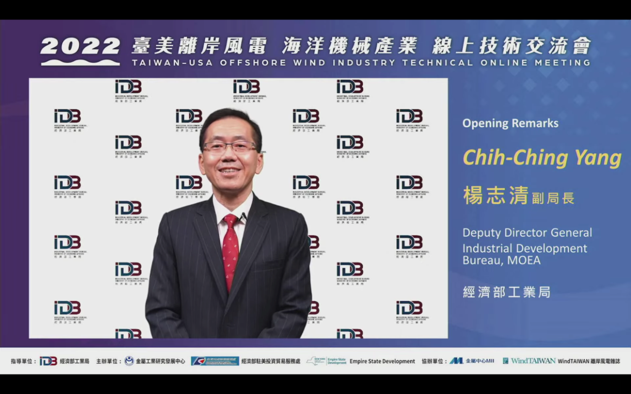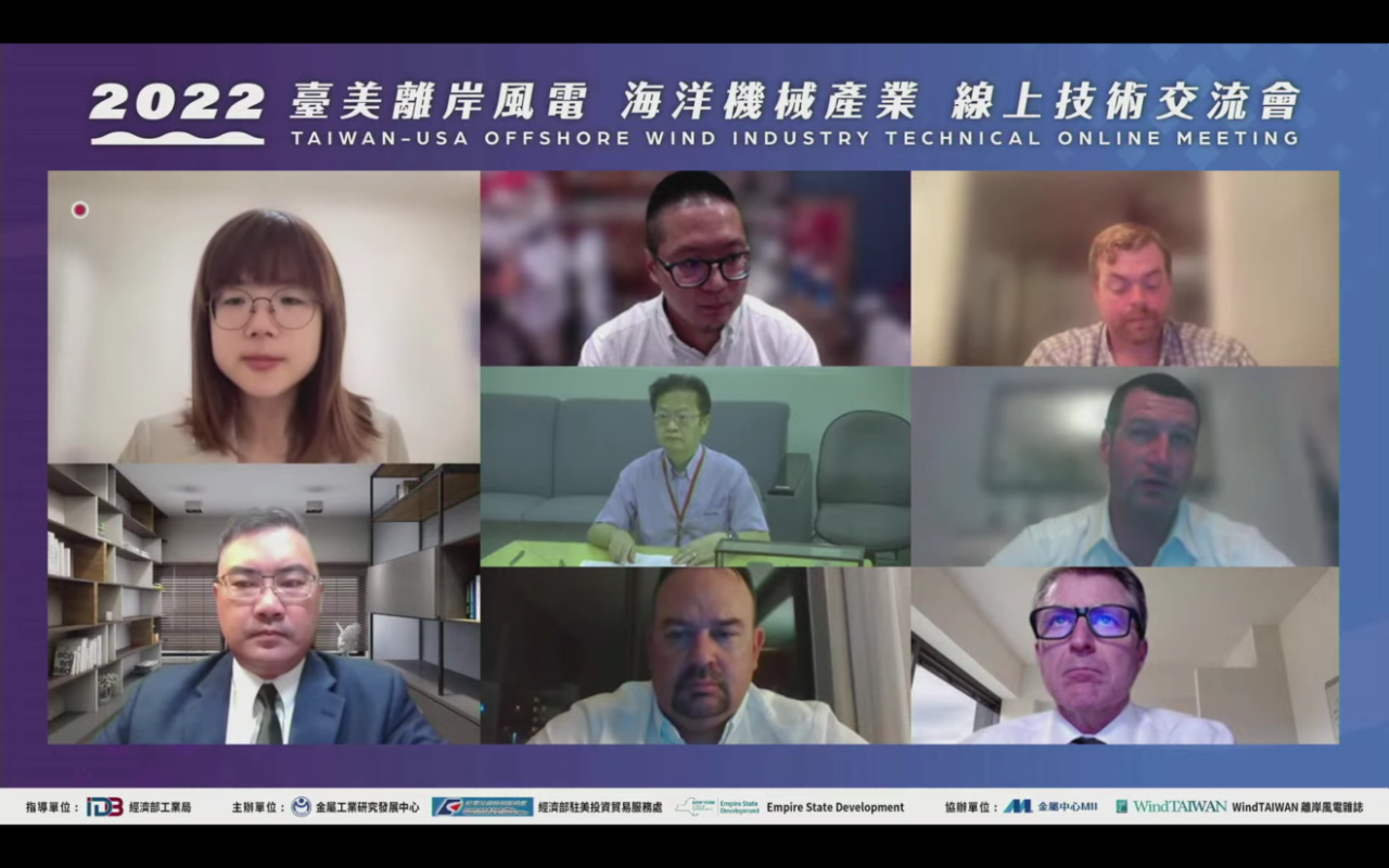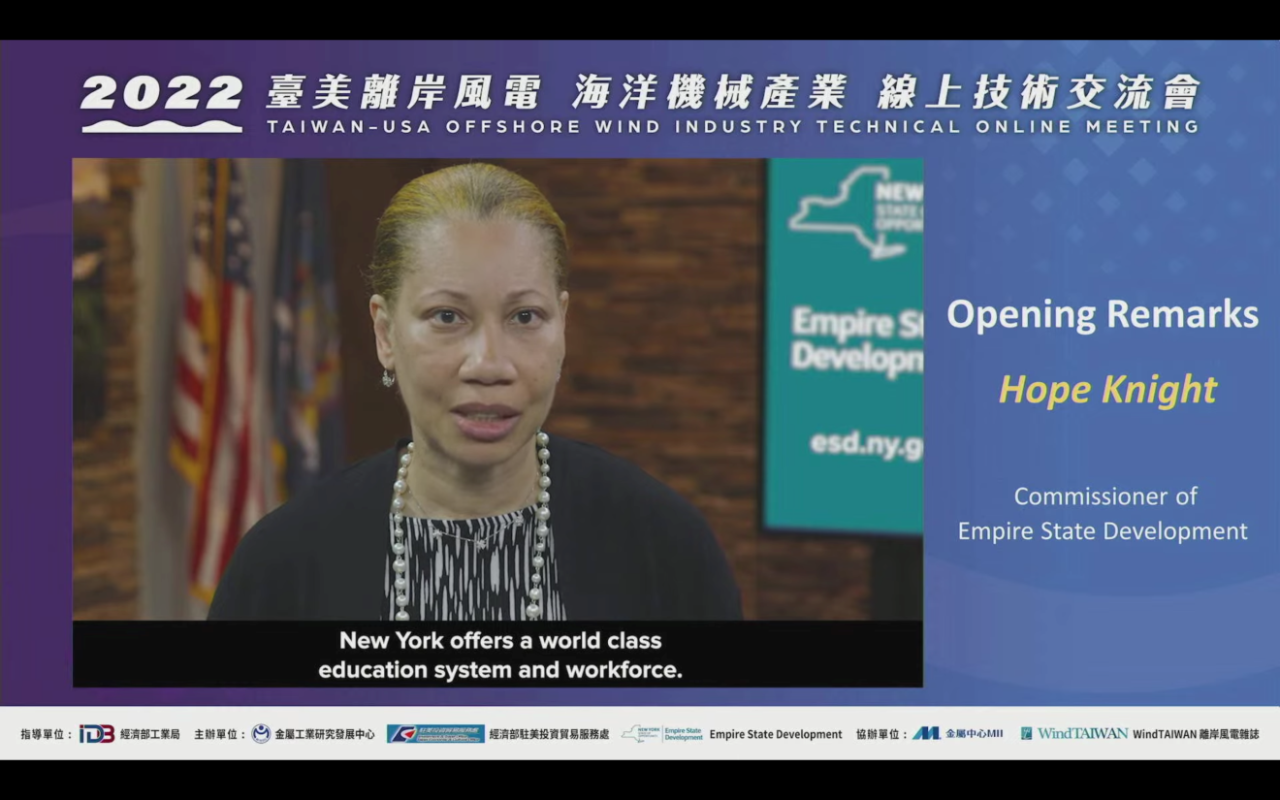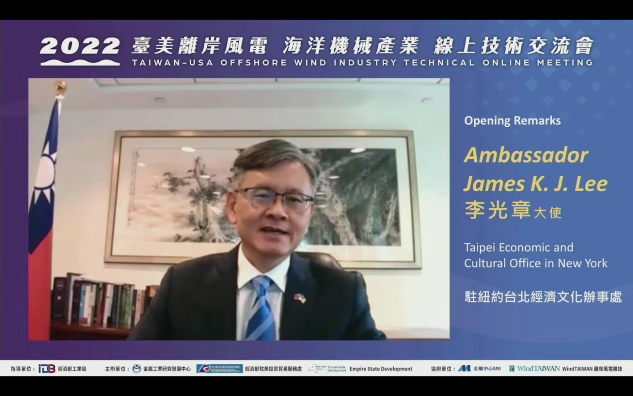 為加強推動臺美離岸風電產業供應鏈合作,駐美投資貿易服務處與紐約州經發廳及經濟部工業局(金屬工業研究發展中心)共同合作,於美東時間本年8月22日晚間舉辦「2022臺美離岸風電海洋機械產業線上技術交流會」,計有近百名臺美產官學研代表參加,並由駐紐約辦事處李大使光章、紐約州經發廳長Hope Knight、經濟部工業局楊副局長志清採預錄方式開場致詞。