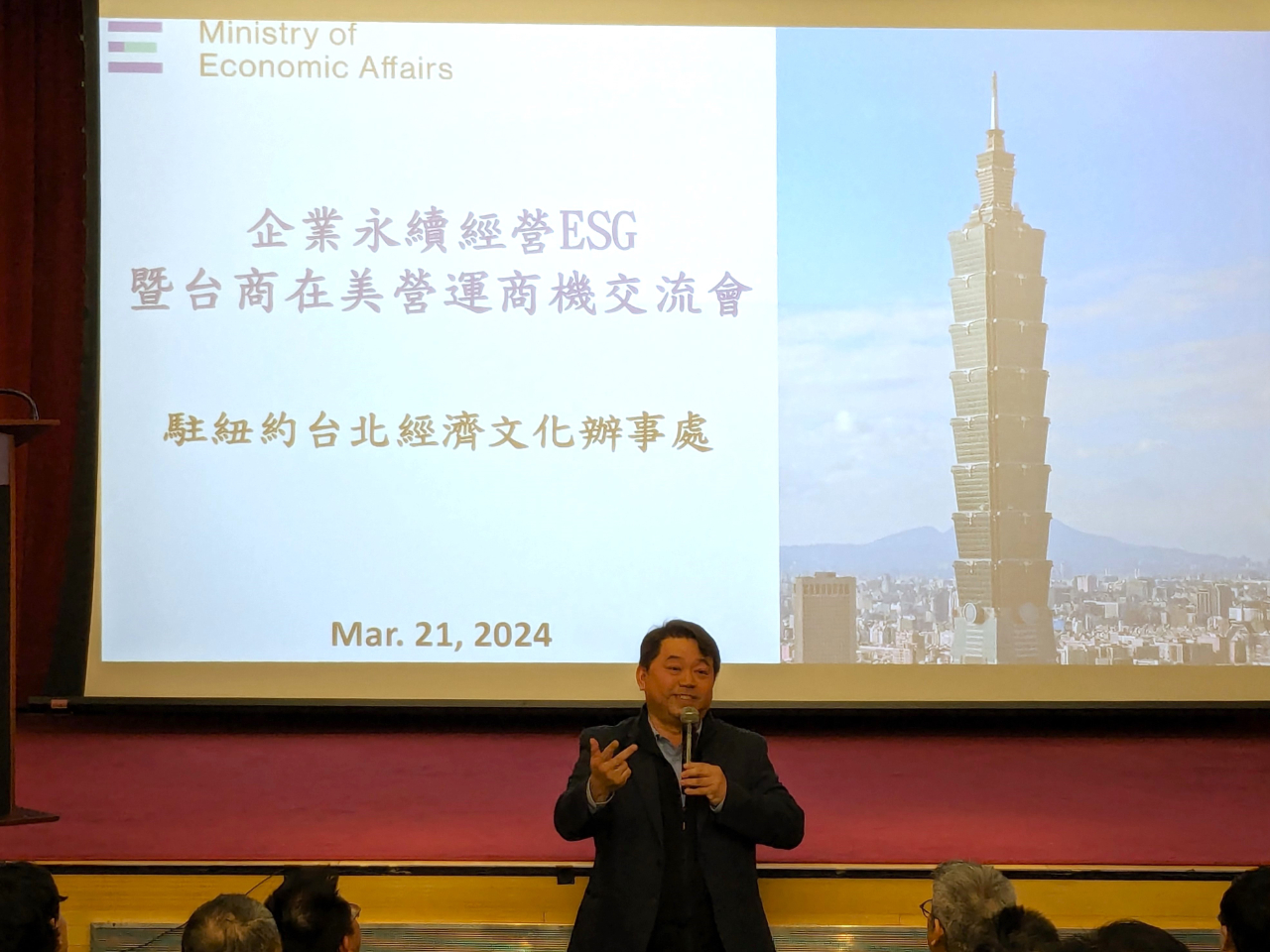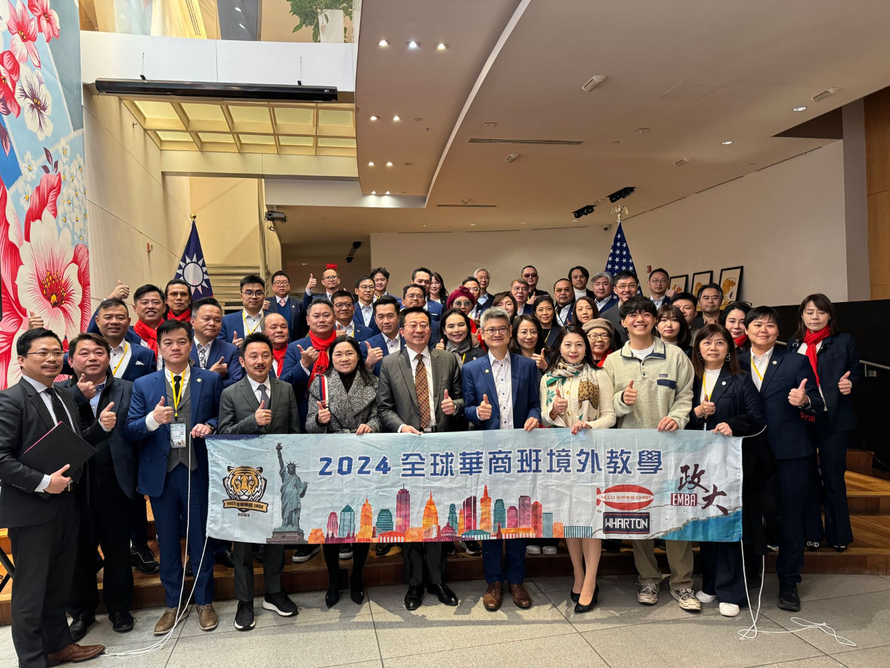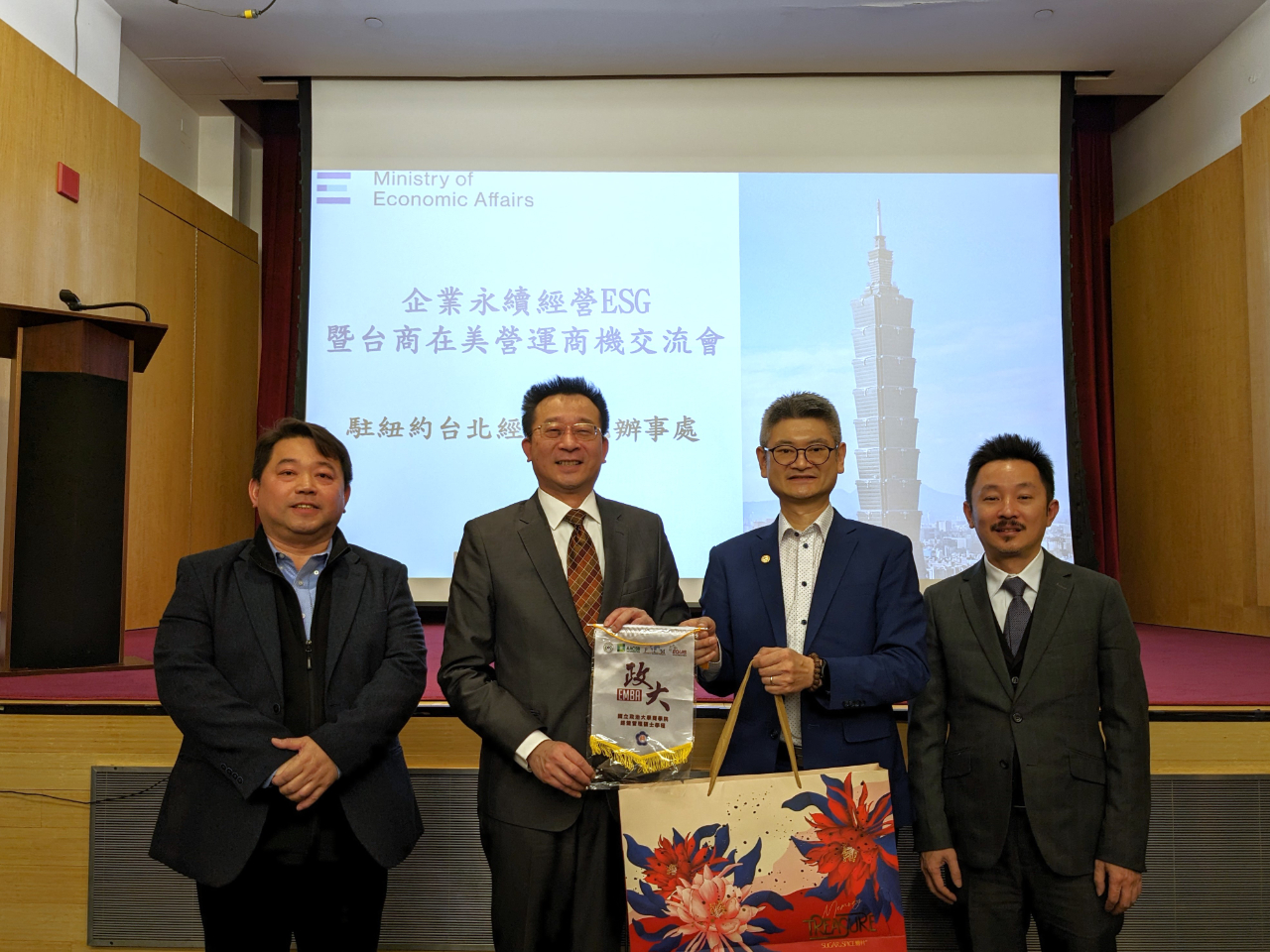 國立政治大學EMBA一行43人拜會駐紐約辦事處 國立政治大學經營管理碩士學程班(EMBA)全球華商班一行43人由執行長鄭至甫教授率團,於本(3)月21日前來拜會駐紐約辦事處,由該處張俊裕公使出面接待,為歡迎訪團到訪,駐美投資貿易服務處與紐約台灣商會共同舉辦「企業永續經營(ESG)暨台商在美營運商機交流會」,會中邀請碳權交易平台土星永續股份有限公司低碳長余嘉熹介紹全球碳經濟最新趨勢,並由紐約台灣商會會長林慶甫、圖策科技技術長徐正榮博士等分享在紐約的創業歷程及營運模式。 駐紐約辦事處張俊裕公使致歡迎詞表示,政大EMBA為我國享有盛名之商學管理學院,為企業培育眾多高階領導人才,辦理成效獲國際肯定。近年各界以企業重視ESG程度作為評斷企業營運良莠、永續發展關鍵指標,盼透過本次活動協助我商深入瞭解全球低碳經濟發展等最新趨勢。 政大EMBA執行長鄭至甫教授表示,全球華商班學員為業界精英,對前往海外發展頗具意願,紐約充滿夢想及資源,期待透過本次交流活動協助學員掌握海外投資與經營秘訣。 駐美投資貿易服務處葉士嘉主任說明台美經貿關係密切,雙方建立經濟繁榮夥伴對話(EPPD)、科技貿易暨投資合作(TTIC)架構等合作平台,推動半導體、5G、電動車、再生能源等產業供應鏈合作。各國訂出具體淨零碳排時間表,我國已宣示2050年達到淨零碳排目標。 土星永續低碳長余嘉熹簡報說明我國達成2050淨零轉型4大架構、2大基礎及12項關鍵策略,以及全球碳權交易發展最新趨勢。他指出,各國為達成巴黎協定要求每噸碳價須介於50至100美元,商機龐大;接著藉由檢視台灣企業所需碳權類型、碳交易展望、國際作法及各類型態碳封存技術,以金管會上市櫃公司路徑圖分享企業制定ESG目標及達成淨零碳排策略。 本次活動包括北美台灣商會聯合總會江俊霖會長、紐約地產專家黃江美瑩、MoVi Capital顧問Freddy Lin、中華航空紐約分公司武志厚總經理、第一銀行紐約分行廖清芳經理、華南商業銀行紐約分行彭子娟經理、外貿協會駐紐約辦事處蔡主任秀珍等人與訪團交流,分享紐約食品零售、人工智慧、物流營造、金融新創等創業經驗,協助學員瞭解美國市場現況以利拓展商機,有助該團企業家學員拓展美國商機。(E) 圖說: 圖一:訪團於駐紐約辦事處大廳合影。 圖二:訪團致贈駐紐約辦事處禮品,左起紐約台灣商會會長林慶甫、駐紐約辦事處公使張俊裕、政大EMBA執行長鄭至甫教授、北美台灣商會聯合總會長江俊霖。 圖三:紐約台灣商會會長林慶甫。 圖四:碳權開發管理企業土星永續低碳長余嘉熹。 圖五:圖策智能科技技術長徐正榮博士。 圖六:紐約資深地產專家黃江美瑩。