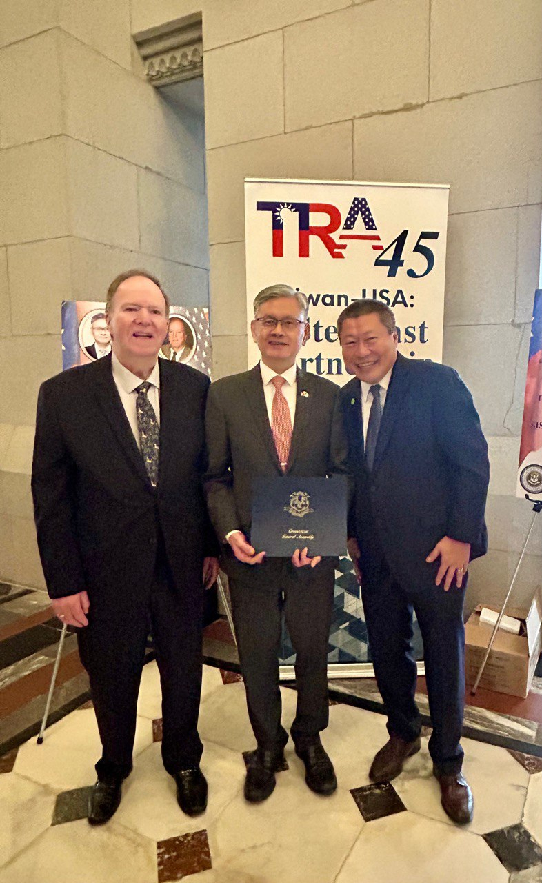 2024年4月17日新聞稿第005號康乃狄克州眾議會通過友台決議表彰《台灣關係法》立法45週年 康乃狄克州眾議會4月17日無異議通過表彰《台灣關係法》立法45週年及台灣與康州締結姊妹州25週年共同決議案,強調台美共享自由民主價值,雙方在《台灣關係法》及「六項保證」的基礎上,深化各領域的合作,有助維護台海和平穩定,並祝賀台灣今年1月順利完成自由公平的選舉。該決議由康州眾議會友台小組主席Kevin Ryan領銜推動,除重申台灣為成熟的民主國家,具穩健的自由市場經濟外,並肯定台灣為美國在印太區域不可或缺的夥伴;康州將續支持台美洽簽雙邊貿易協定(BTA)及避免雙重課稅協定(ADTA),發展更緊密的經貿夥伴關係。該決議並支持台康增進華語文教育交流,及簽署駕照互惠協定,以促進雙邊人民往來。 本年決議亦支持美國協助台灣參與「世界衛生組織」(WHO)、「國際民航組織」(ICAO)、「國際刑警組織」(INTERPOL)、「聯合國氣候變化綱要公約」(UNFCCC)及其他國際組織。本處李光章處長受邀見證康州議會通過友台決議,並於同日中午與州議會合辦慶祝茶會。李處長在茶會上致詞表示,值此「台灣關係法」邁入45週年之際,拜登政府多次肯定台灣是成功的民主故事,世界良善力量,及美國值得信賴的夥伴。台美堅若磐石的夥伴關係亦獲美國國會跨黨派支持,期盼未來台灣與康州在既有的良好基礎上,持續深化雙邊產業、科技合作及教育交流,攜手共譜民主成功故事的新篇章。(E) 圖說一:駐紐約辦事處李處長光章4月17日在康州慶祝台灣關係法45週年暨台康締結姊妹州25週年茶會上,與議會友台小組共同主席Kevin Ryan(左)及黃濤(Tony Hwang, 右)合影。圖說二:康州眾議會4月17日通過友台決議表彰「台灣關係法」立法45週年及台康締結姐妹州關係25週年。圖說三:康州眾議長 Matt Ritter(右)4月17日在州眾議會祝賀「台灣關係法」立法45週年暨台康締結姊妹州關係25週年。
