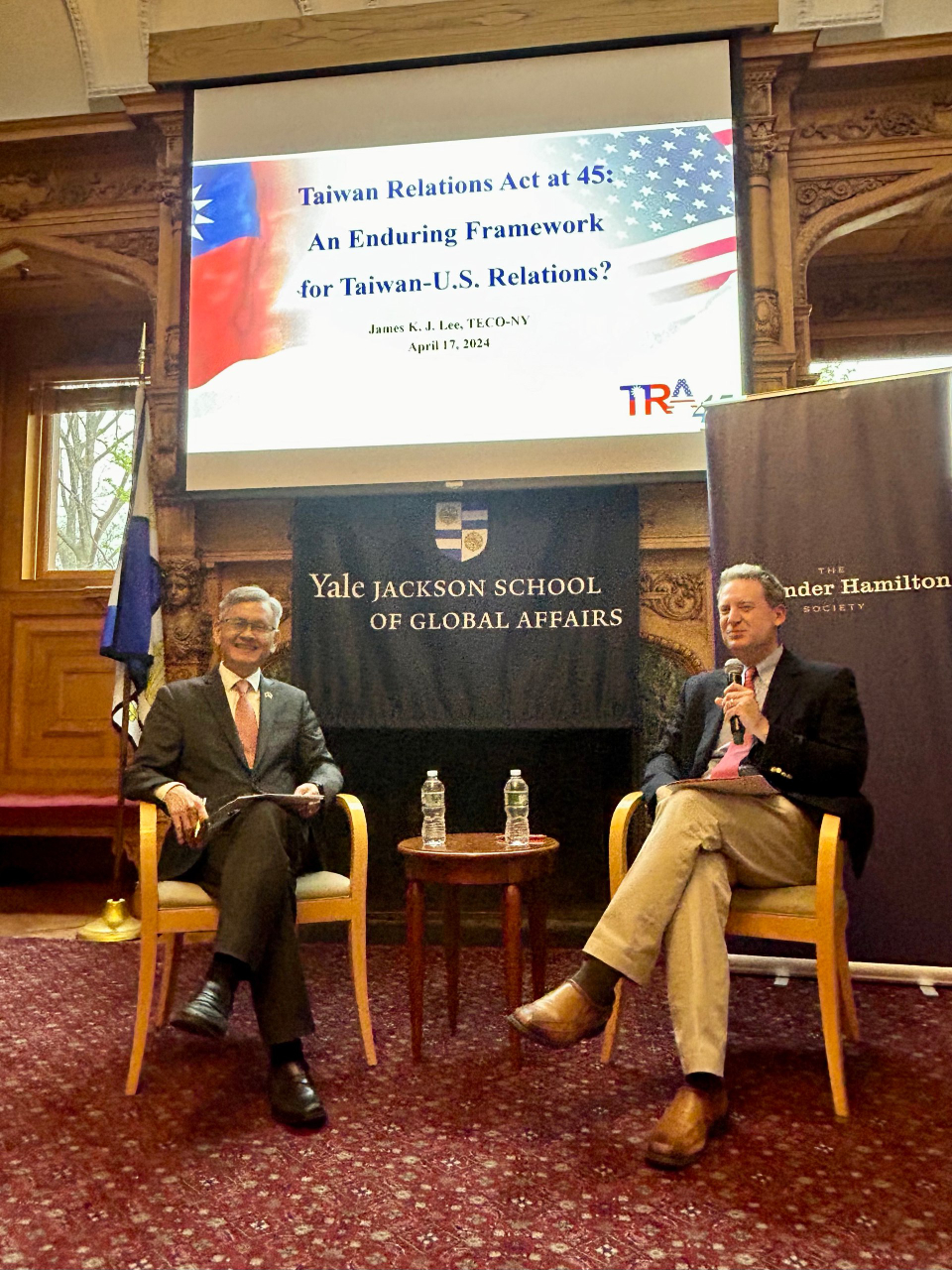 本處李光章處長4月17日,應「漢密爾頓協會-耶魯分會」(Yale Alexander Hamilton Society)及耶魯大學傑克森全球事務學院邀請,就《台灣關係法》立法45週年發表專題演講,向耶魯大學師生說明該法之立法源起及對台海情勢的意涵,演講會由該校國際安全研究主任Edward Wittenstein主持。李處長強調,由於美國信守《台灣關係法》及「六項保證」,45年來,台美關係雖歷經波折起伏,卻歷久彌堅。台灣已成為成功的民主故事、美國值得信賴的夥伴及世界良善的力量。台灣在印太地緣戰略、全球供應鏈及民主發展上均扮演重要角色。台海和平穩定為印太區域安全繁榮的基石,台灣將續與美國等民主夥伴攜手合作,維護台海和平現狀及以規則為基礎的國際秩序。 李處長另說明聯合國當年討論聯大第2758號決議的歷史背景及近年來中國在國際場域擴大曲解該決議的意圖,除藉此排除台灣參與聯合國體系,也企圖虛構台灣為中國內部事務不容國際干預的假象,為未來武力侵台鋪路,呼籲美國知識分子協助澄清反制。李處長演說後回答現場師生有關兩岸關係展望、印太民主國家聯合抗中形勢、台灣對美國應否援助烏克蘭的看法、台灣國防、台灣反制威權專制經濟脅迫、假訊息介選、半導體產業對全球人工智慧發展的重要性、能源安全及外交政策與國際參與等提問,氣氛熱烈;晚間並與該校師生代表及康州議會友台小組主席Kevin Ryan與助理多數黨領袖Aundre Bumgardner等餐敘,就如何增進雙方交流合作交換意見。(E)圖說:本處李處長光章4月17日應邀在耶魯大學發表《台灣關係法》45週年演說與該校國際安全研究主任Edward Wittenstein合影。