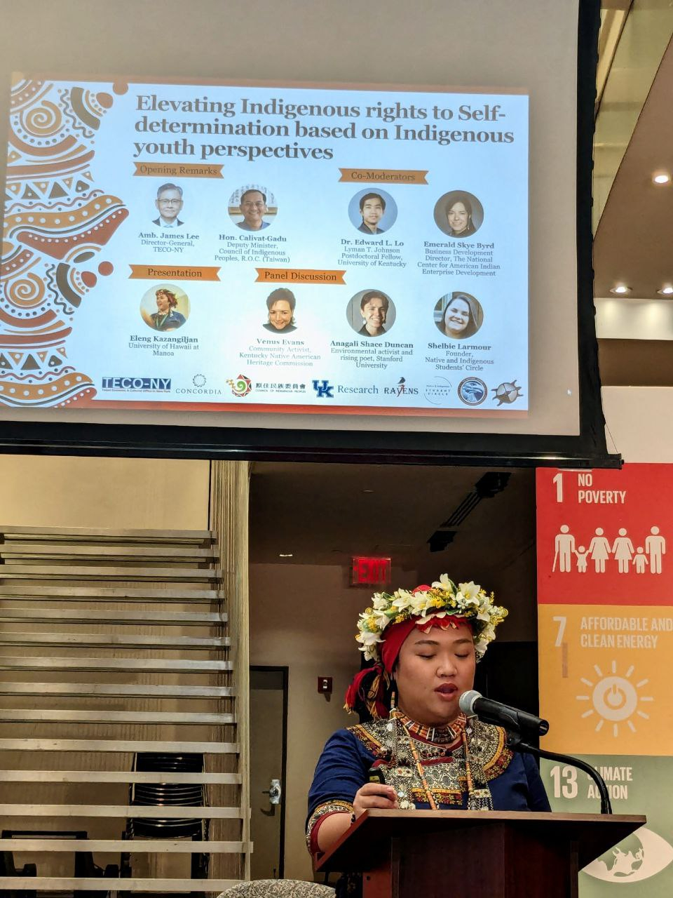 駐紐約台北經濟文化辦事處、中華民國原住民族委員會及美國肯塔基大學(University of Kentucky)於美東時間4月24日下午6時在駐紐約辦事處合辦「以原住民青年視角為基礎,提升原住民族自決權」(Elevating Indigenous Rights to Self-Determination Based on Indigenous Youth Perspectives)研討會,配合第23屆「聯合國原住民常設論壇」(UNPFII 23)主題,邀請台美原住民青年代表就提升原民權利進行分享。多國駐聯合國代表團官員、來紐約參加UNPFII之各國代表及民間團體等各界人士共約60人出席。