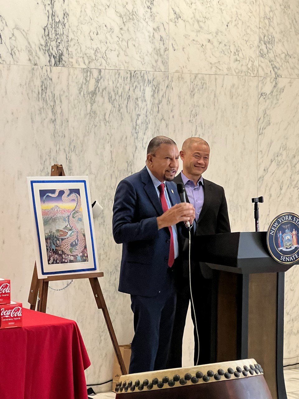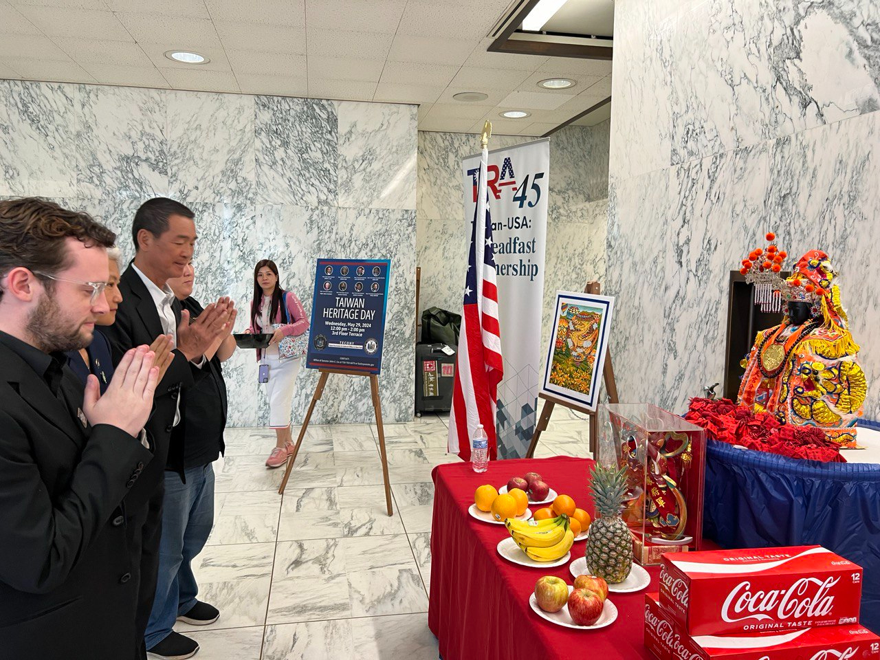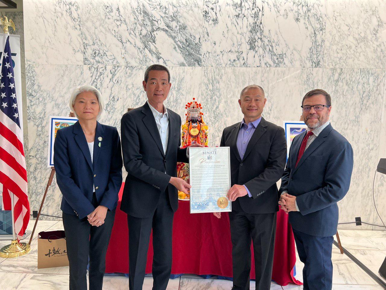當日州議會舉辦「台灣傳統日茶會」,計有參、眾議會跨黨派領袖20餘位出席並致詞,北港朝天宮媽祖神尊駐駕祈福,搭配台南十鼓擊樂坊鼓樂精彩的演出,展現台灣特有傳統藝術文化,讓紐約州議會充滿濃濃的台灣味。參議會教育委員會主席劉醇逸(John Liu)並頒贈賀狀予北港朝天宮及十鼓擊樂坊。