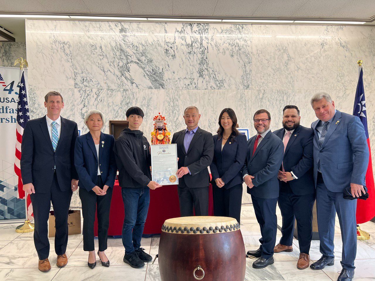 圖四:紐約州參議員頒贈賀狀予十鼓擊樂坊。左起:眾議員Edward Braunstein、參議員曲怡文、十鼓樂坊藝術總監謝懷鈺、參議員劉醇逸、眾議員Grace Lee、參議員Luis Sepulveda、眾議員John Zaccaro、眾議員Alec Brook-Krasny。