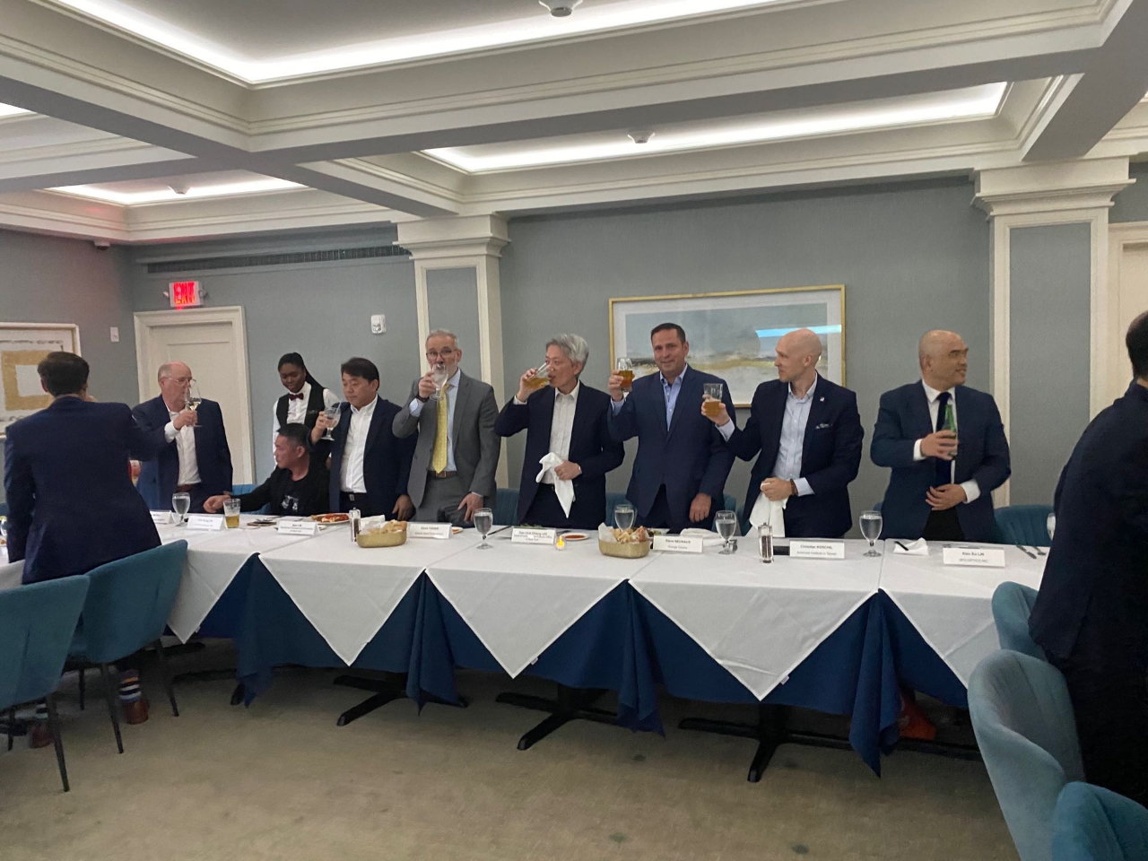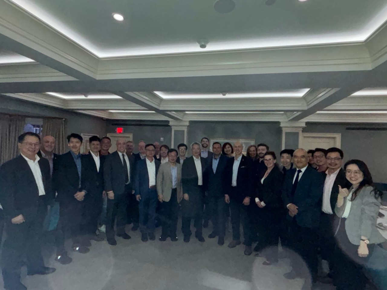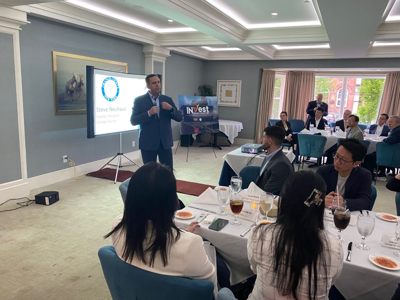 台灣人工智慧與量子分團一行15人於5月7日至9日前來紐約州考察當地微電子產業生態系與潛在商機,並於7日晚間參加由駐紐約經文處與紐約州橘郡政府(Orange County)合辦之歡迎晚會。經文處李志強大使與橘郡郡長Steve Neuhaus共同歡迎訪團到來,與會賓客包括美國在台協會台北辦事處(AIT/T)商務官Christian Koschil、紐約州經發廳(Empire State Development,ESD)副廳長Kevin Younis、橘郡經濟發展機構Orange County Partnership總裁暨執行長Conor Eckert、紐約台灣商會會長林慶甫、美商Allendale Machinery Systems副總裁Martin McGill等約30餘人與會交流。