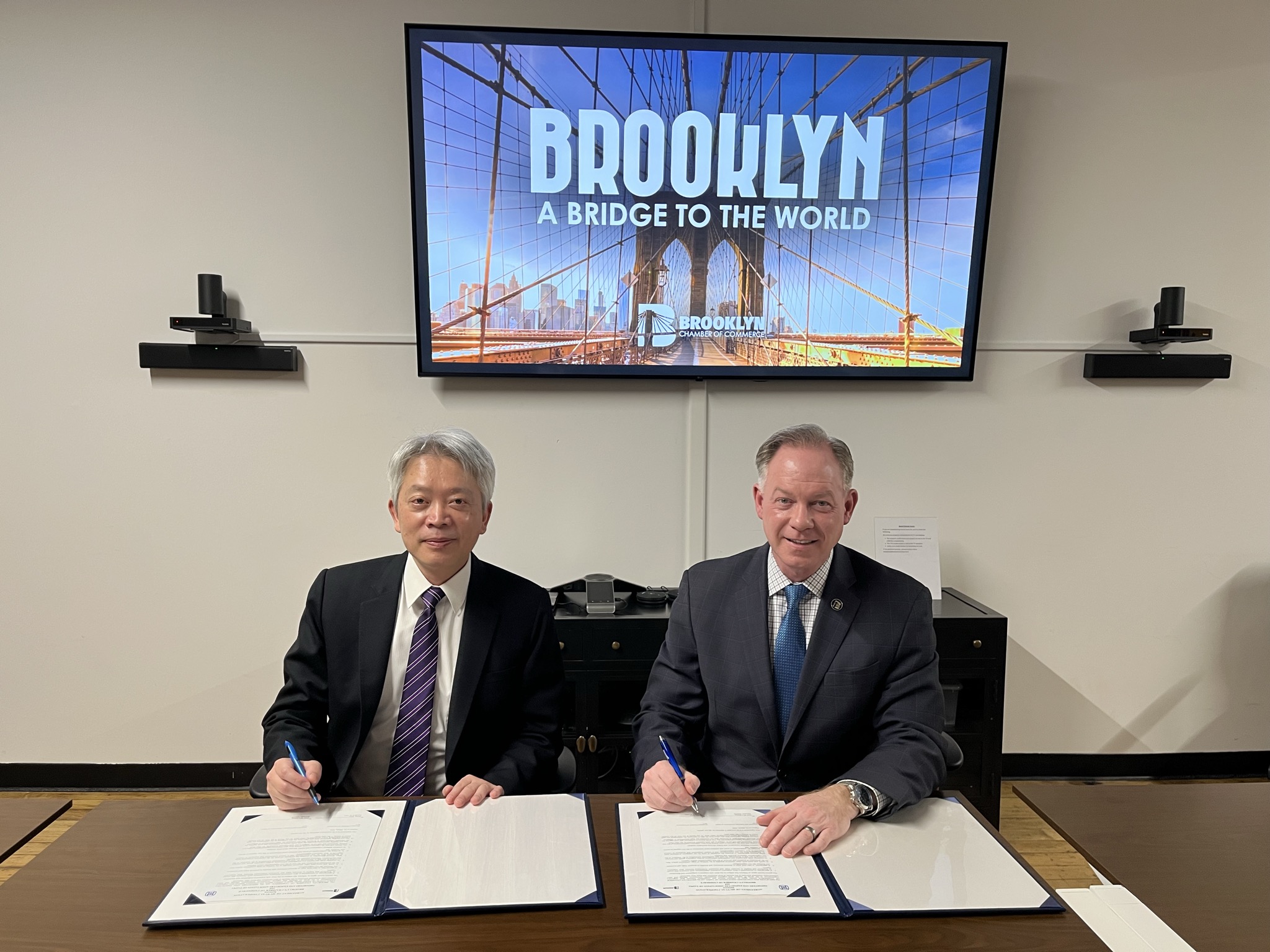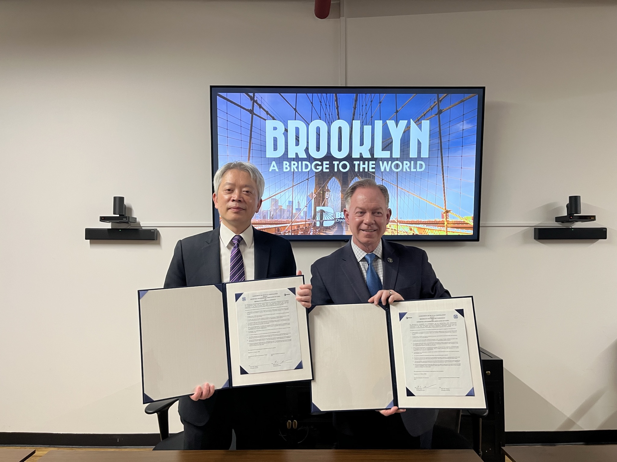 為協助台北市進出口商業同業公會拓展與美東產業關係人國際合作關係,本處於去(2025)年11月主動推薦布魯克林商會,嗣經兩會評估同意,成功促成此次MOU,雙方將據此協助對方拓銷與交換市場資訊。
