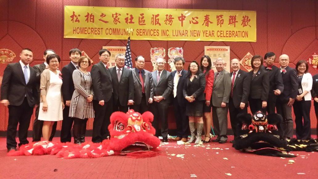 紐約松柏之家社區服務中心2月26日舉辦春節聯歡會,紐約華僑文教服務中心張希賢副主任、紐約州白彼得(Peter J. Abbate, Jr. )、寇頓(William Colton)兩位州議員、崔馬克(Mark Treyger)市議員、紐約市主計長斯靜格(Scott M Stringer)、民主黨紐約州黨領導唐巧鳳女士、美洲協勝公會譚炳垣總理、美國安良工商會鄧錦源總理及社區僑領約600人參加了這場春節活動。