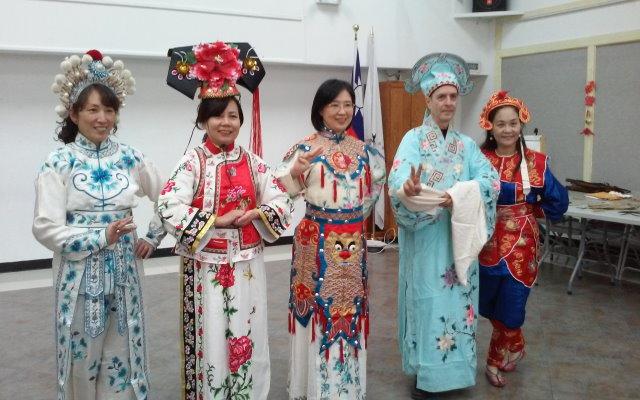 中國戲劇工作坊第三次與紐約華僑文教服務中心合作開設戲劇工作坊課程,3月18日的記者會上,紐約文教中心主任王映陽(左二)、副主任王盈蓉(中)、中國戲劇工作坊創辦人馮光宇(右1)及Stephen Kaplin(右2)等人粉墨登場推廣中國戲曲文化。