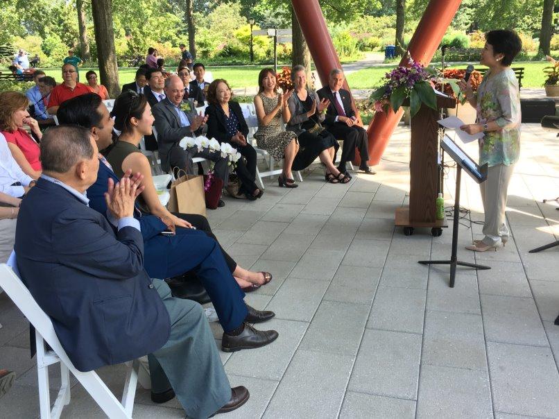 駐紐約臺北經濟文化辦事處徐儷文大使(右立者)於皇后區植物園「臺灣蘭花展」開幕致詞大力推廣臺灣蘭花產業。