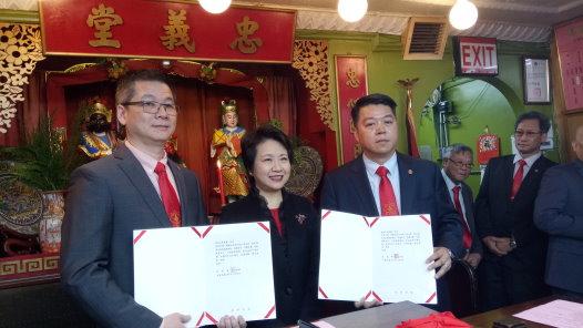 紐約洪門致公堂2018年度新職員就職典禮12月17日下午在該堂舉行。李庭信、伍煥強兩位蟬連主席在駐紐約臺北經濟文化辦事處徐儷文大使、楊光彬副處長、紐約華僑文教服務中心黃正杰主任、張希賢副主任、紐約中華公所蕭貴源主席、美國安良工商會鄧錦源總理、美洲協勝公會伍銳賢總理及紐約市議員陳倩雯等100多位嘉賓的見證下,從伍煥鵬總顧問、李柱燊總監堂及李偉強總理手中接過印信﹐正式宣誓就任。