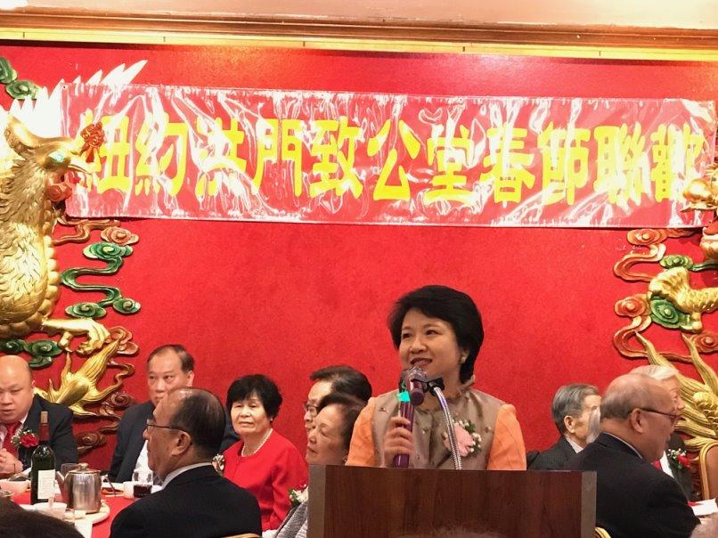 春宴開始首先由紐約洪門致公堂李庭信主席致歡迎詞,感謝紐約僑領及各地洪門致公堂的會員蒞臨。徐儷文大使則在致詞中感謝洪門致公堂長期以來對中華民國的支持。席間徐儷文大使並與伍煥鵬總顧問之姊姊及夫人一同合唱「小城故事」,黃正杰主任與陳倩雯市議員合唱「萬水千山總是情」,博得滿堂喝采,祝現場洋溢著喜氣熱鬧的新春氣氛。
