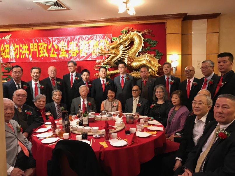 紐約洪門致公堂2月23日晚間在華埠喜運來大酒樓席開40桌舉辦春宴,駐紐約臺北經濟文化辦事處徐儷文大使、張必強組長、紐約華僑文教服務中心黃正杰主任、王盈蓉副主任、葉帝余副主任、全美中華會館中華公所聯誼會伍煥鵬總顧問、美洲協勝公會伍銳賢總理、林惠明總理、美國安良工商會陳達偉總理、鄧錦源總理和美國洪門致公總堂李偉強總理、白杰雄總理、李柱燊總監堂、紐約中華公所蕭貴源主席、美東聯成公所黃達良主席、紐約臺山寧陽會館伍籍泮主席等社區僑領皆出席盛宴,與洪門昆仲共度佳節。
