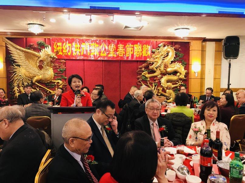 紐約洪門致公堂2月12日晚間在華埠喜運來大酒樓舉辦春節聯歡宴會,駐紐約辦事處大使徐儷文、副處長張俊裕、紐約華僑文教服務中心主任黃正杰、副主任王盈蓉與葉帝余、美洲協勝公會元老團主席、美國洪門致公總堂總顧問伍煥鵬、美洲協勝公會總理伍銳賢與黃有為、美國安良工商會總理鄧遐勳、元老團主席伍健生和美國洪門致公總堂總監堂李柱燊、總理李偉強與白杰熊等社區僑領皆出席盛宴,與洪門昆仲共度佳節。