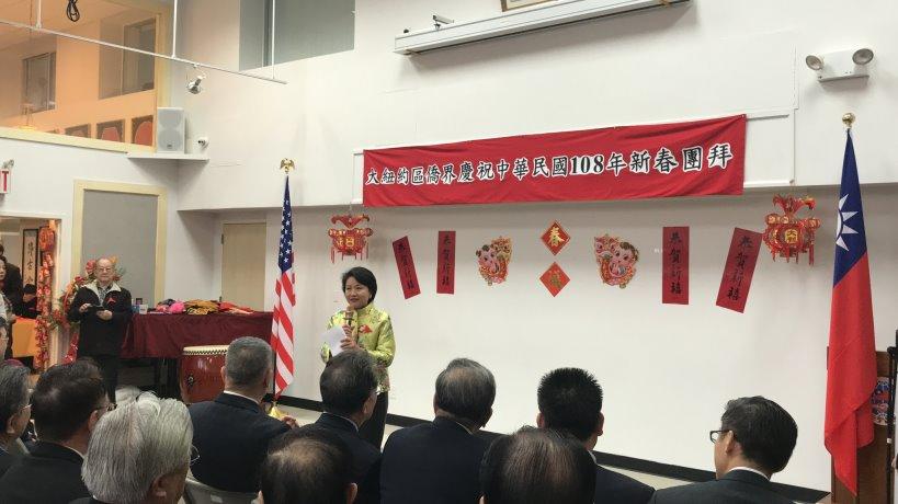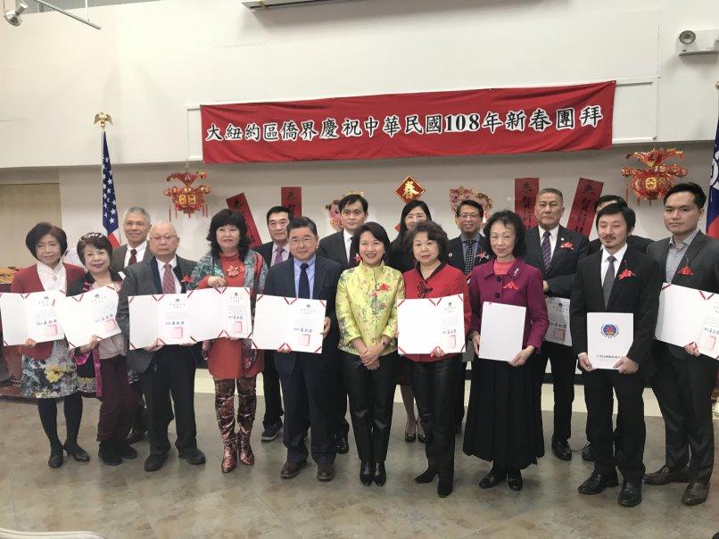 「大紐約區僑界慶祝中華民國108年新春團拜」2月16日上午在紐約華僑文教服務中心熱鬧舉行,由駐紐約辦事處大使徐儷文主持,紐約州參議員史塔文斯基(Toby Ann Stavisky)與金兌錫(Ron Kim)、紐約市議員顧雅明(Peter Koo)及紐約中華公所主席伍銳賢、僑務委員戴松昌、王金智、胡慶祥、莊振輝、謝己、伍健平、黃仕初、美國安良工商總會總理鄧遐勳等大紐約地區傳統及新興僑社代表近200位出席,將整個大禮堂擠得水泄不通,社區老、中、青三代人歡聚一堂,互道新年祝福,會場喜氣洋洋,年節氣氛濃郁。