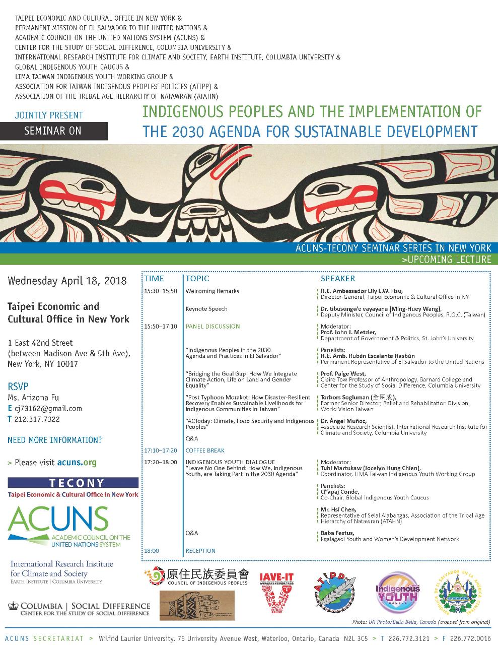 This event is jointly presented by Taipei Economic and Cultural Office in New York, Permanent Mission of El Salvador to the United Nations, Academic Council on the United Nations System (ACUNS), Center for the Study of Social Difference, Columbia University, International Research Institute for Climate and Society, Earth Institute, Columbia University, Global Indigenous Youth Caucus, LIMA Taiwan Indigenous Youth Working Group, Association for Taiwan Indigenous Peoples’ Policies, and Association of the Tribal Age Hierarchy of Natawran.