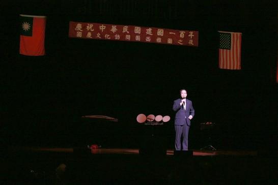 共同主席陳美君首先代表致歡迎詞,感謝僑委會派遣優秀演藝團體「無雙樂團」來西雅圖演出,獲僑胞熱烈支持,高朋滿座。嗣由團長任弘副委員長、廖處長東周分別致詞,感謝僑胞熱愛中華民國,踴躍參加本年西北區慶祝中華民國建國100年各項活動。華州檢察長Rob Mckenna亦應邀上台致詞,表示即將率全美州檢察長團訪華參加我國慶活動,並祝賀中華民國生日快樂。