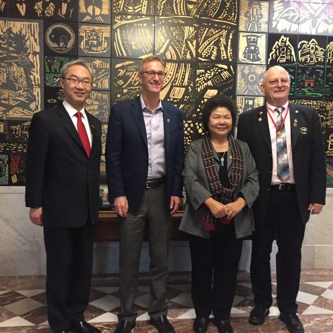 高雄市陳市長菊及高雄市議會康議長裕成、蔡副議長昌達率團於本(106)年6月9日及10日率市府官員及市議會議員等近40人訪問姊妹市波特蘭市,拜會波特蘭新任市長Ted Wheeler並出席玫瑰節活動。