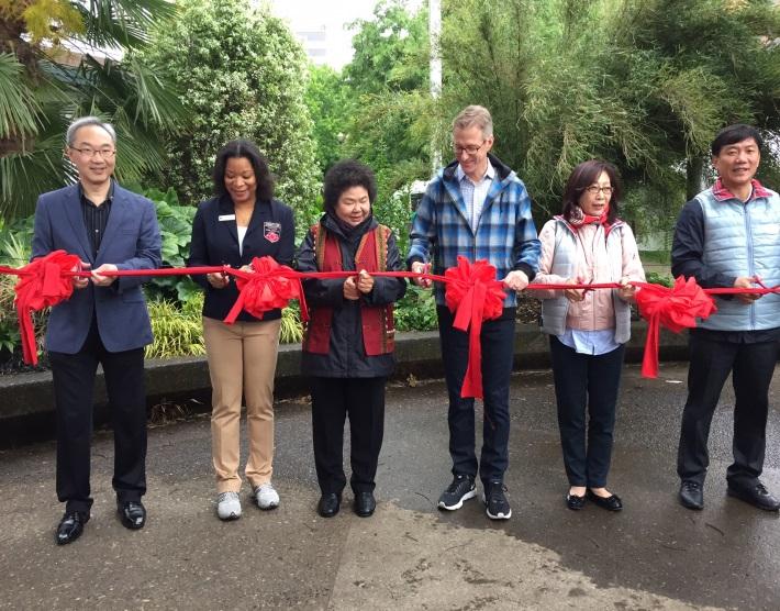 6月10日陳市長、康議長、蔡副議長、Ted Wheeler市長、姚處長及玫瑰節下屆主席Teri Bowles-Atherton共同為龍舟競賽活動剪綵。