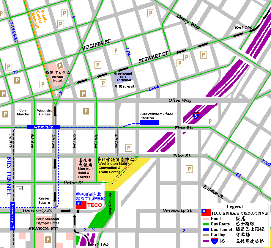 歡迎蒞臨駐西雅圖臺北經濟文化辦事處,本處位於中心市,交通十分便利。建議您前來辦事處之前,先閱覽或列印有關交通或運輸資訊,以收事半功倍之效並免途勞往返。