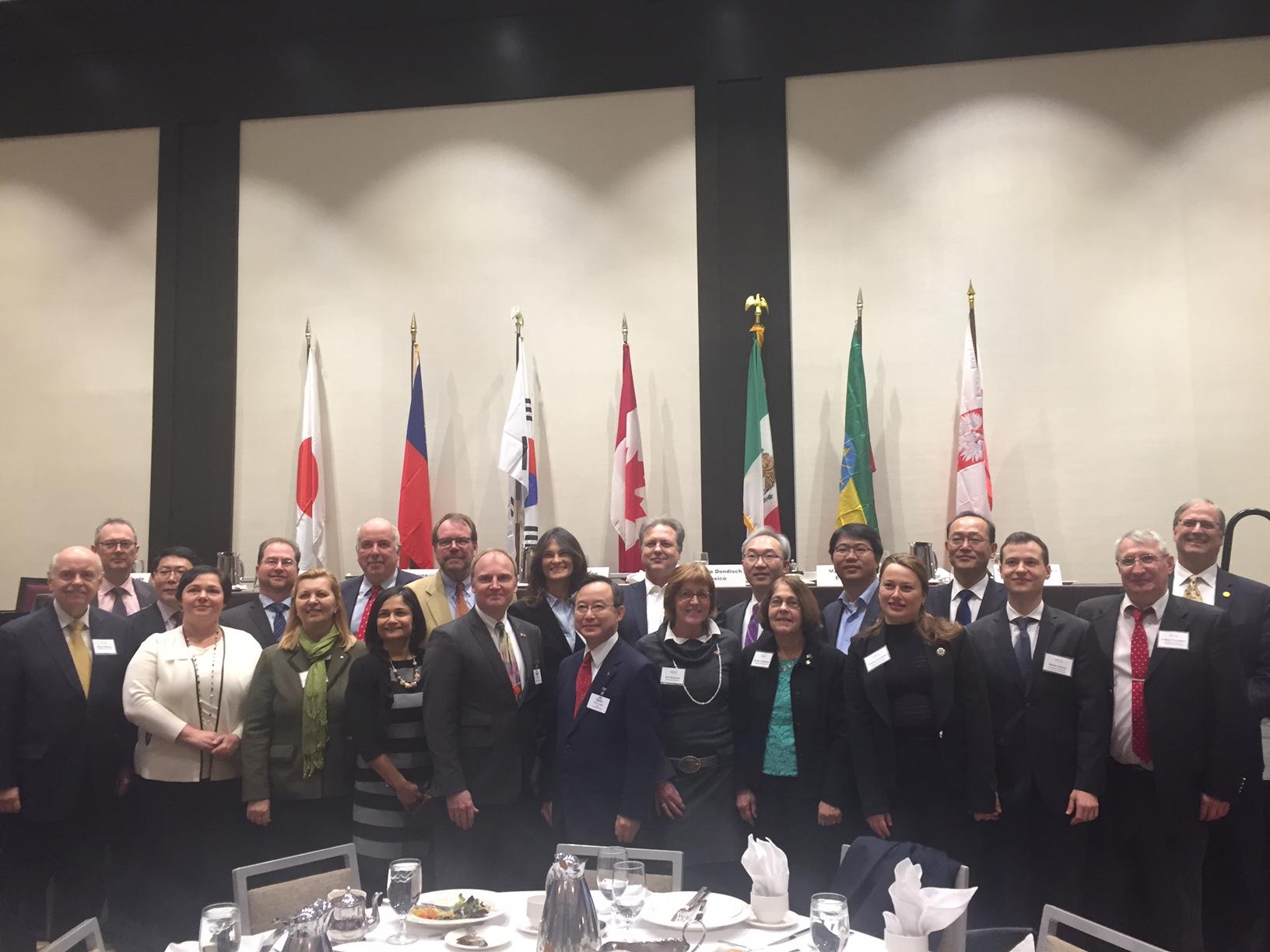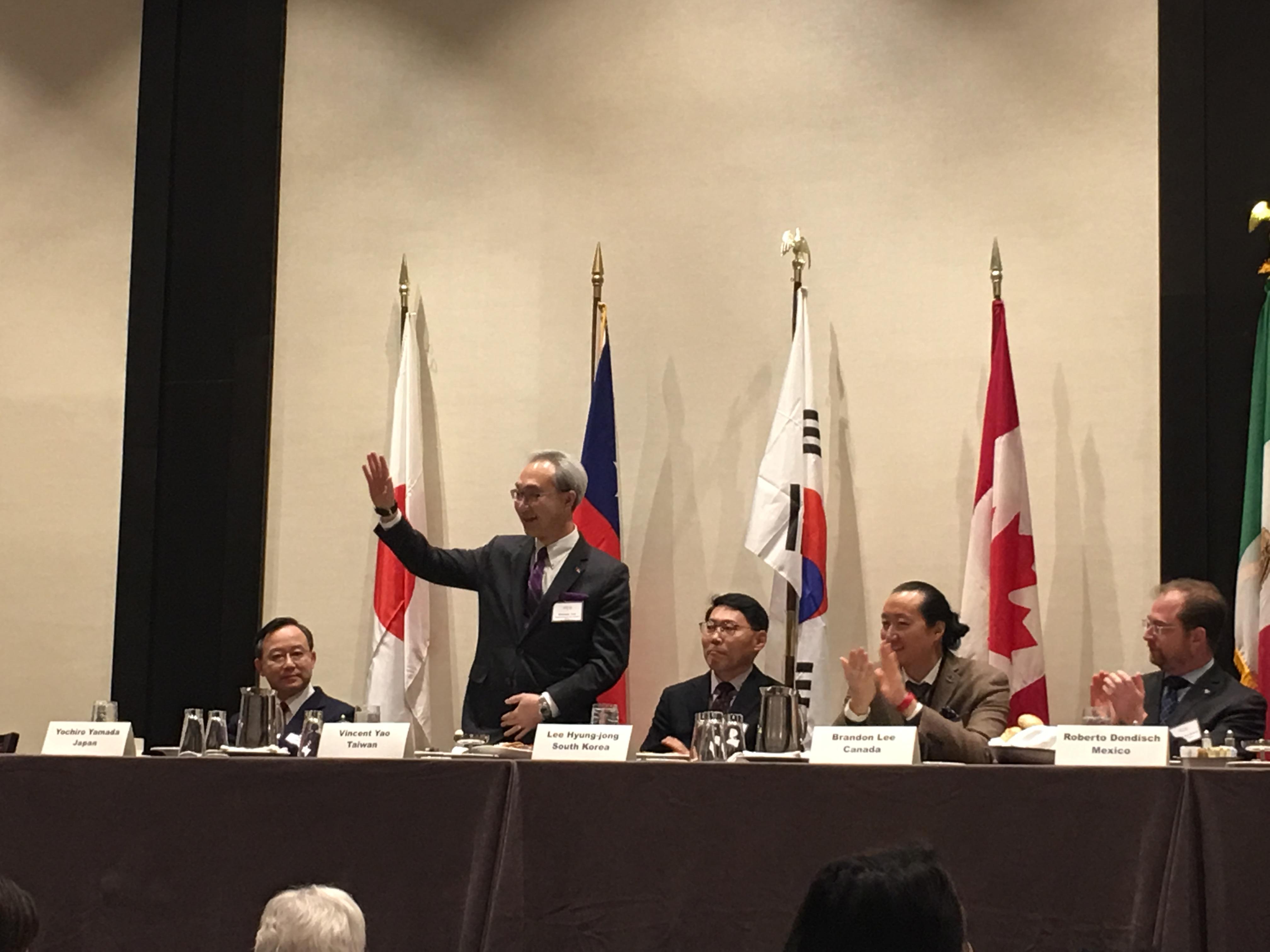本處姚總領事金祥本(2月21)日中午偕史副組長書蕙、紀副領事佩汾、陳副領事冠廷及西雅圖高雄姐妹市協會吳會長小燕出席西雅圖扶輪社舉辦之「外交日」活動,是日主辦單位與華盛頓州領事協會合作,邀請西雅圖副市長(印度裔)Shefali Ranganathan及各國駐西雅圖總領事或領事(包括職業外交官及名譽領事)等出席午餐會,與現場約300位會員交流,其中姚總領事獲安排與加拿大總領事Brandon Lee、日本總領事Yochiro Yamada、南韓總領事Lee Hyung-jong、墨西哥領事Roberto Dondisch、波蘭名譽領事暨華州領事協會新任會長Teresa Indelak Davis及衣索比亞名譽領事Mark Gantar等坐於講台主桌。