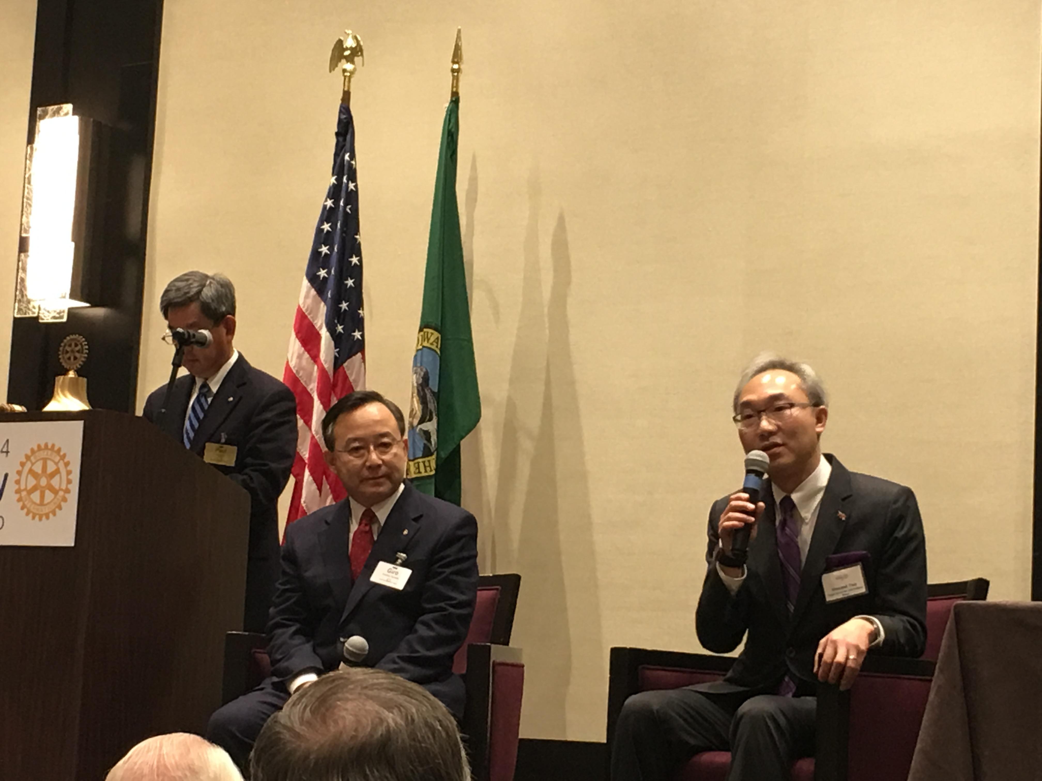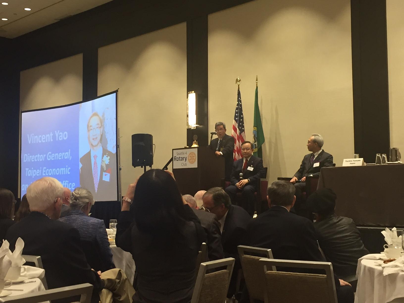 活動首先由扶輪社社長(此間King 5 電視台主播)Mark Wright及該社外交小組(Diplomacy Task Force)召集人David Woodward致詞並簡介新加入扶輪社之加、韓、衣3國總領事或名譽領事,嗣以影片依序播放加、日、墨、韓、台等5國總領事談話,輔以各國國情影片為背景,隨後由扶輪社前社長Paul Ishii引導姚總領事及日本總領事Yochiro Yamada上前就坐,以「東亞國家之外交觀點」為題專訪兩國對美國國安政策及自由貿易之看法。