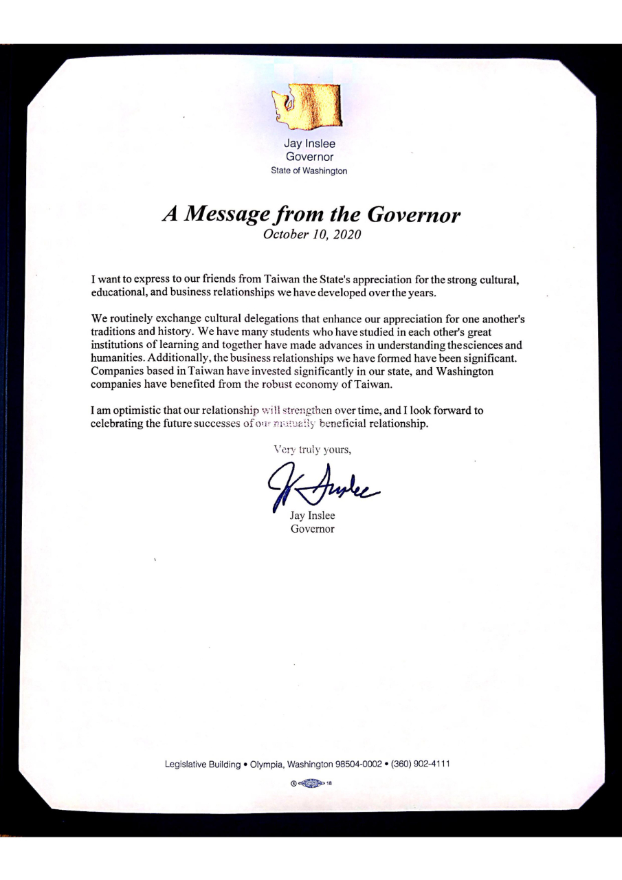 華盛頓州州長Jay Inslee致函本處,盼臺灣及華州在既有堅實經貿、文化及教育基礎上持續合作,並深信雙邊關係將不斷深化。駐西雅圖辦事處誠摯感謝,並將積極促進各項合作。