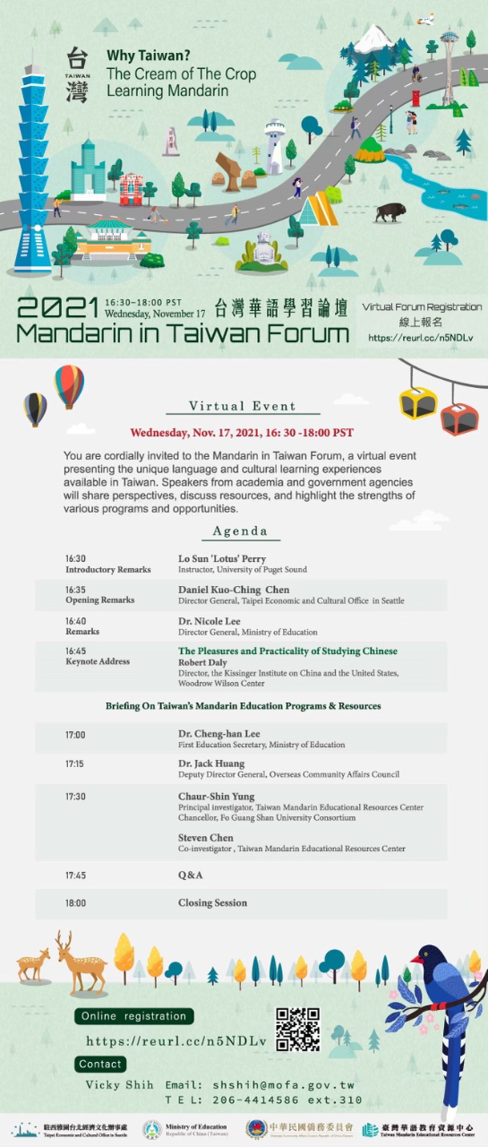 駐西雅圖辦事處訂於美西時間11月17日(星期三)下午4時30分至6時舉辦「2021台灣華語學習論壇」視訊會議,邀請威爾遜國際學人中心季辛吉美中研究所所長戴博(Robert Daly)、教育部國際及兩岸教育司司長李彥儀、僑務委員會僑教處副處長黃正杰、台灣華語教育資源中心計畫主持人暨佛光山教團系統大學總校長楊朝祥、教育部國際及兩岸教育司一等教育秘書李政翰、台灣華語教育資源中心計畫協同主持人陳迪智出席,並由University of Puget Sound講師孫洛擔任主持人,分享學習華語多元管道資源及獨特經驗等,誠摯邀請有志學習華語,以及希望建立華語學習交流合作管道的各界人士參加。