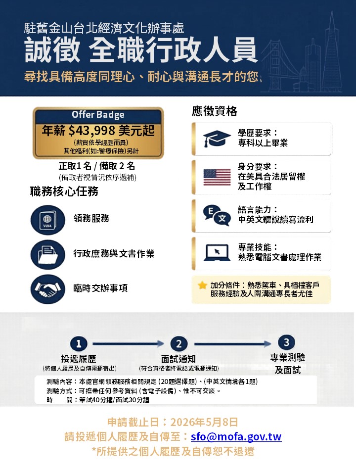 3. 待遇:年薪43,998美元起(薪資依學經歷而異),其他福利另計。