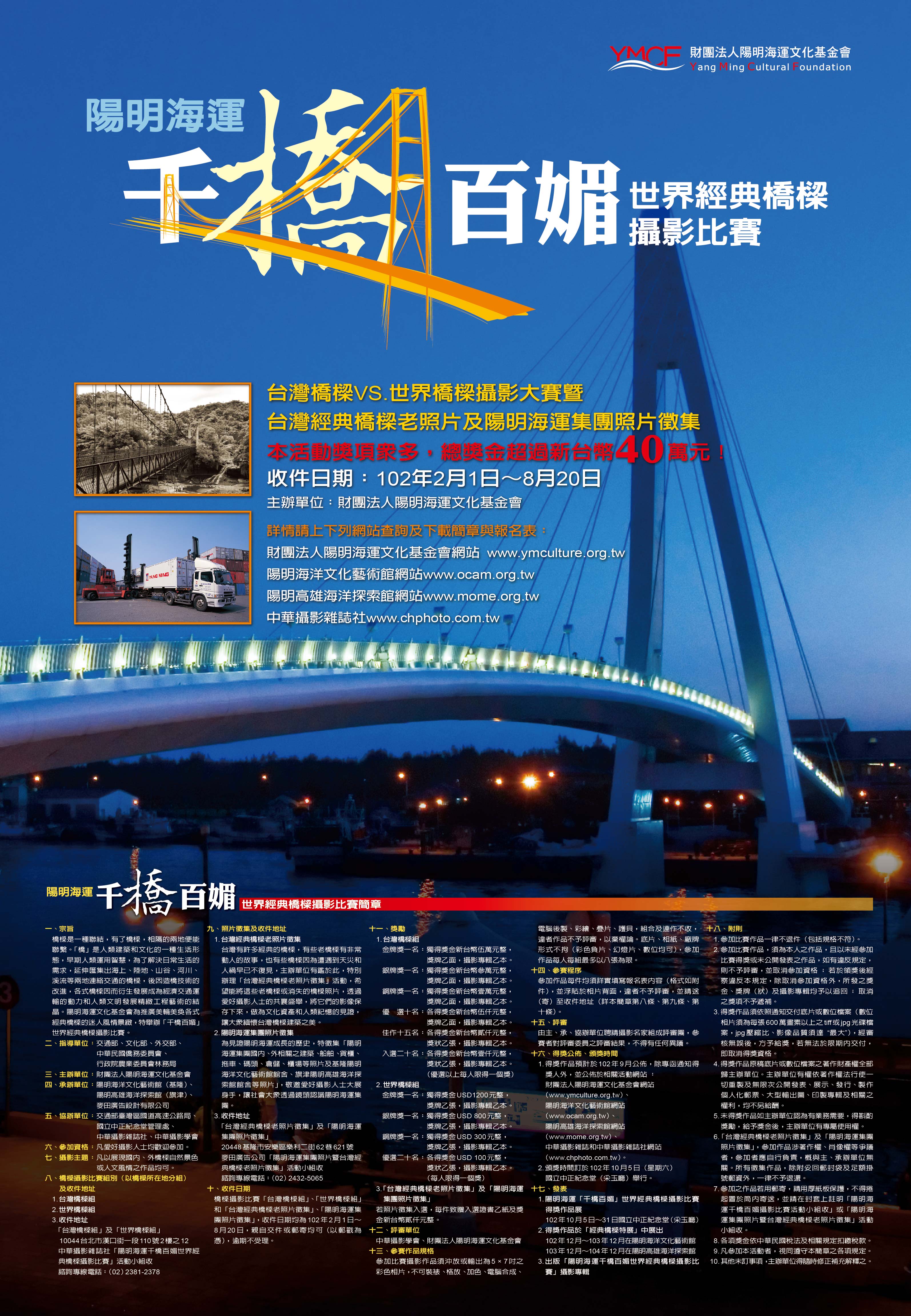 橋樑是一種聯結,有了橋樑,相隔的兩地便能聯繫。「橋」是人類建築和文化的一種生活形態,早期人類運用智慧,為了解決日常生活的需求,延伸匯集出海上、陸地、山谷、河川、溪流等兩地連絡交通的橋樑,後因造橋技術的改進,各式橋樑因而衍生發展成為經濟交通運輸的動力和人類文明發展精緻工程藝術的結晶。陽明海運文化基金會為推廣美輪美奐各式經典橋樑的迷人風情景緻,特舉辦「千橋百媚」世界經典橋樑攝影比賽。