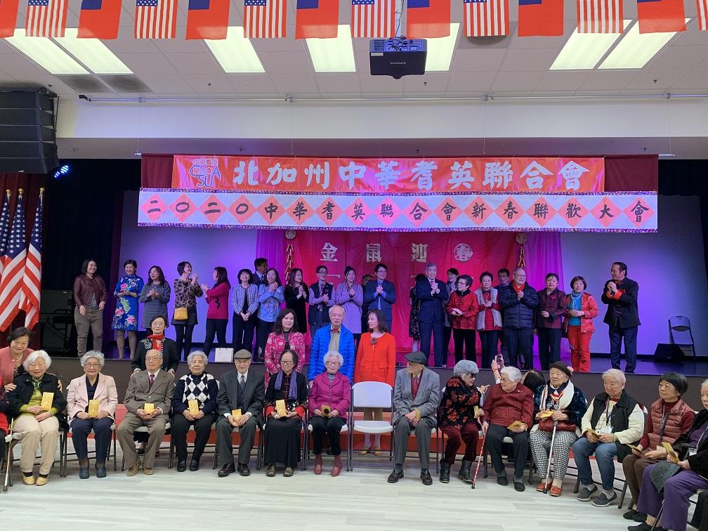 北加州中華耆英聯合會2月2日在灣區僑教中心舉辦2020年慶祝春節鼠來寶聯歡大會,該會所屬會員及家屬近400人參加,當天活動有歡喜團圓餐、向長輩拜年、贈送紅包予90歲、80歲以上耆英、歌唱表演、舞蹈表演、耆老自組合唱團及社團表演,場面熱鬧溫馨。