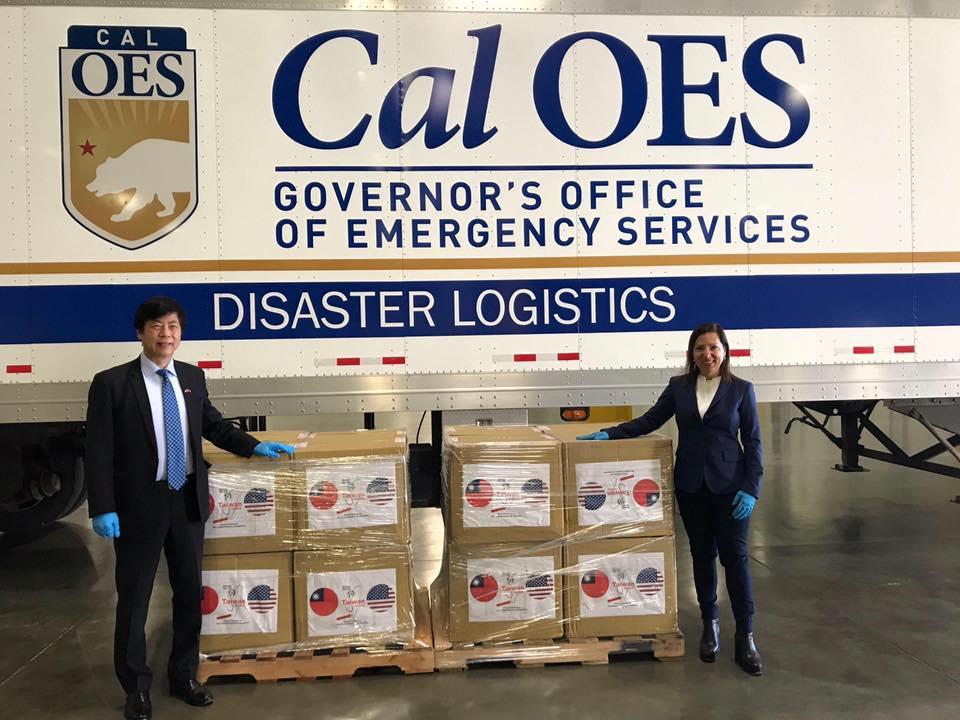 台灣捐贈美國加州的10萬片口罩已經在4月15日運抵加州,駐舊金山辦事處馬處長鍾麟親自將29箱口罩捐贈給加州政府,由副州長康伊蓮(Eleni Kounalakis)代表接受,並將交由州長緊急服務辦公廳(CalOES)立即分配給最需要者。