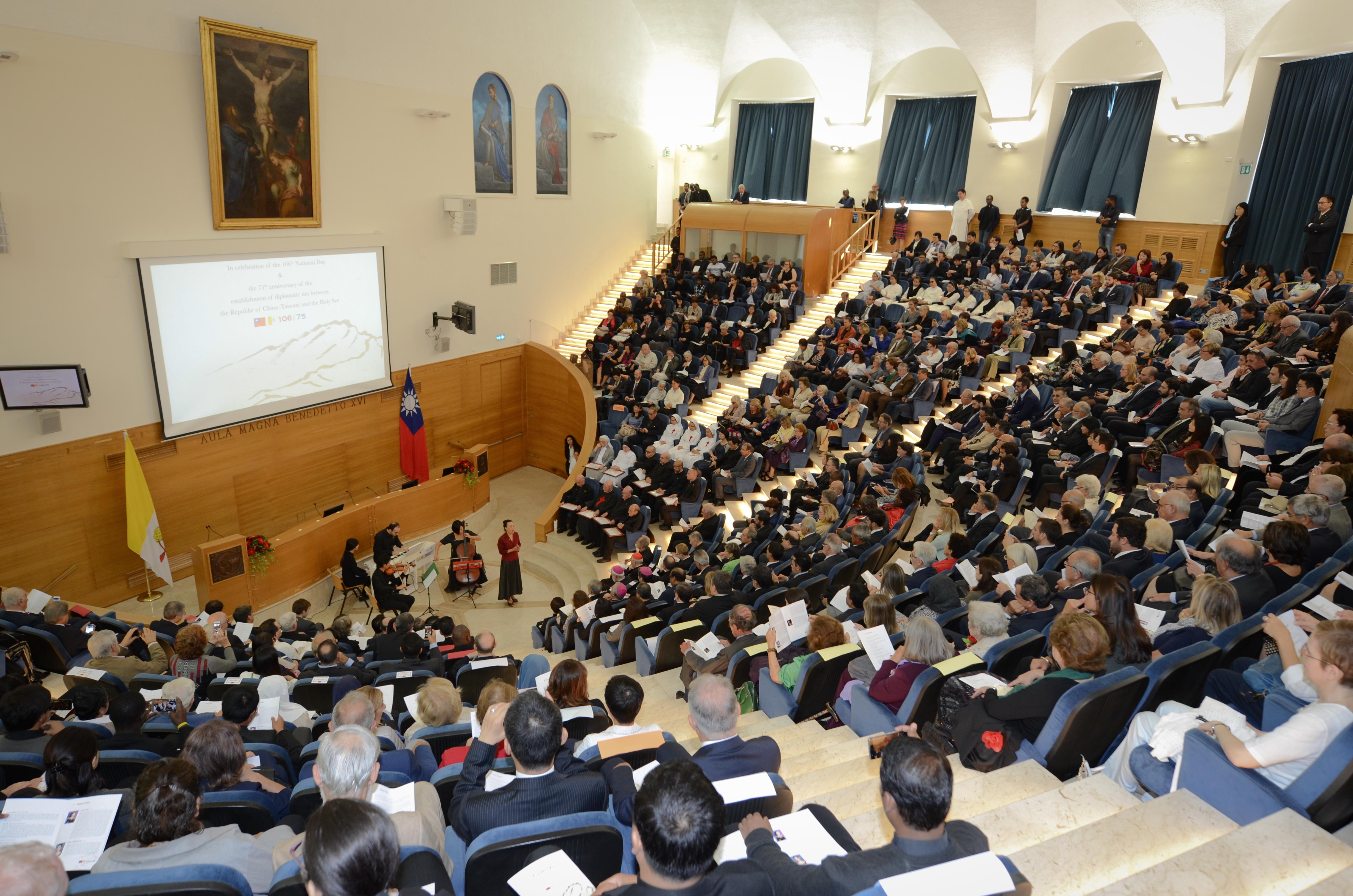 過去中華民國駐教廷使館的國慶酒會多在辦公室或飯店舉行,今年擴大舉辦,首度向教廷大學借用可容納數百人的禮堂。1061006