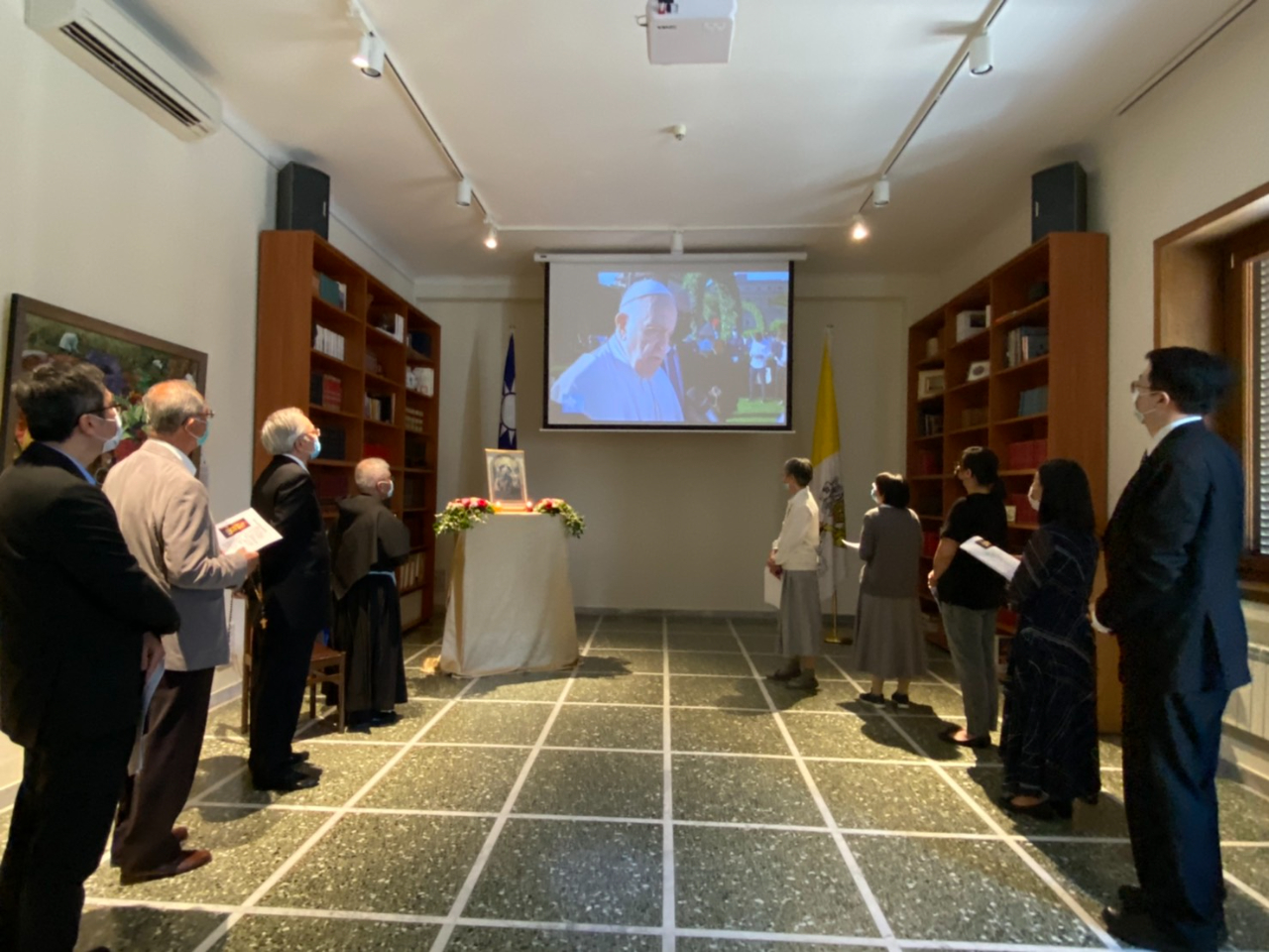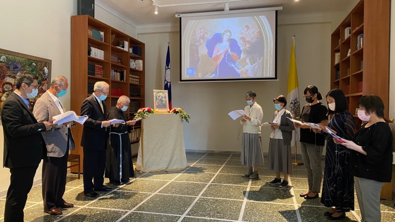 為響應這項有意義的祈福活動,本館特請在梵城工作的邱琮傑神父帶領,李碧圓修女、李柔靜修女、江國雄爵士、教友徐明慧及全體同仁等共同參與下,在解結聖母畫像前,同步與教宗一起誦念玫瑰經,並頌念由臺灣主教團提供的「為早日脫離新型冠狀病毒」祈禱文, 盼臺灣早日脫離疫情。