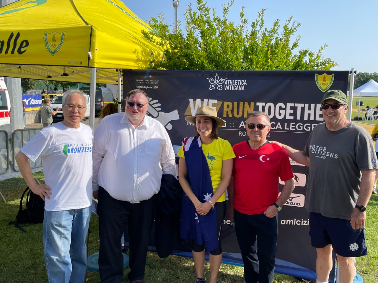 運動會吸引約千人報名參加,這也是教廷外交團首度與會,各國駐教廷大使館組隊參與1600公尺、4人接力友誼賽,其中包括台灣、美國、澳洲、歐盟、比利時等5隊,及英國、土耳其、義大利與加拿大合組的國際隊。(編輯:郭無患)1110525