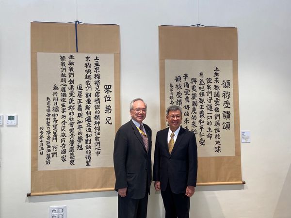 駐教廷大使館指出,今年適逢中華民國與教廷建交80週年,駐館特地邀請知名書畫家,以書畫方式體現教宗方濟各「願祢受讚頌」(Laudato sì)及「眾位弟兄」(Fratelli tutti)通諭及聖經內容。陳建仁伉儷身為虔誠天主教徒,對於駐館的創意與用心表示印象深刻,也對每一幅作品都仔細品味。(編輯:楊凱翔)