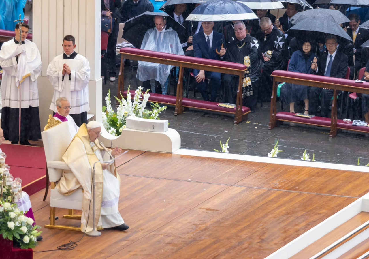 今天的宣福禮大典由教宗方濟各主持,計有各國官方代表團、教廷部會首長、高階神職人員、駐教廷使節團及來自全球各地教友近2萬人參加。近來深受膝傷所苦的教宗方濟各乘坐輪椅抵達會場,在禮賓官攙扶下,緩步前往祭台主持彌撒大典,教宗全程多以坐姿主持大典,但氣色與說話狀態皆不錯,儀式歷時1個半小時結束。(編輯:蘇志宗)1110904