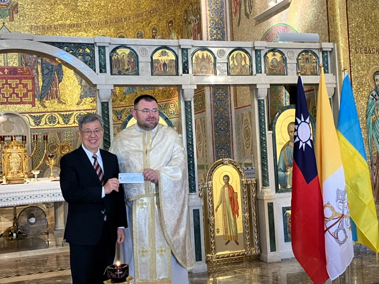 駐教廷大使館向中央社表示,彌撒結束後,所有與會者一起點燃象徵和平的蠟燭,為烏克蘭與台灣祈福。陳建仁隨後代表政府捐款一萬歐元,盼能協助該教堂繼續幫忙流離失所的烏克蘭人民。