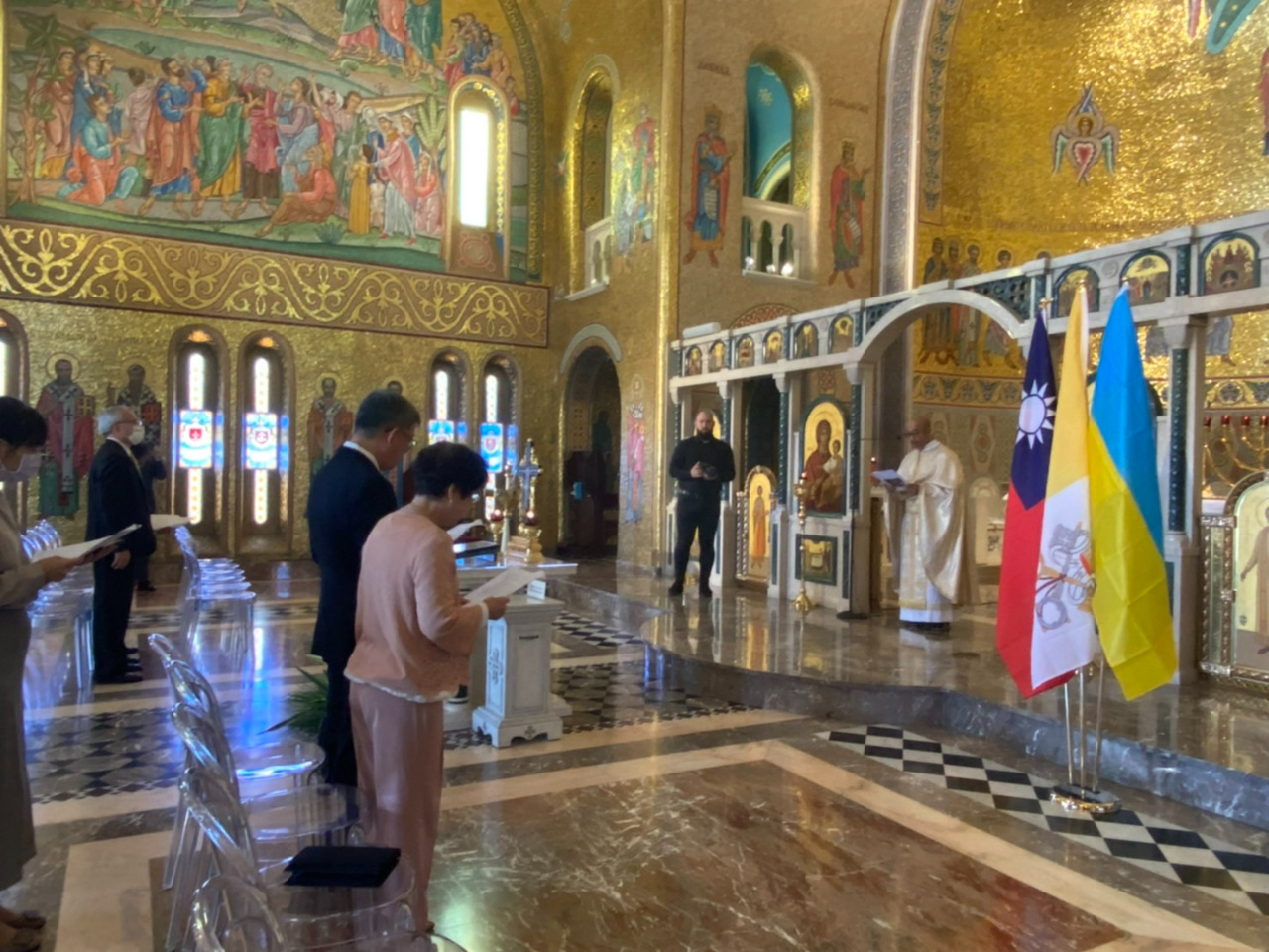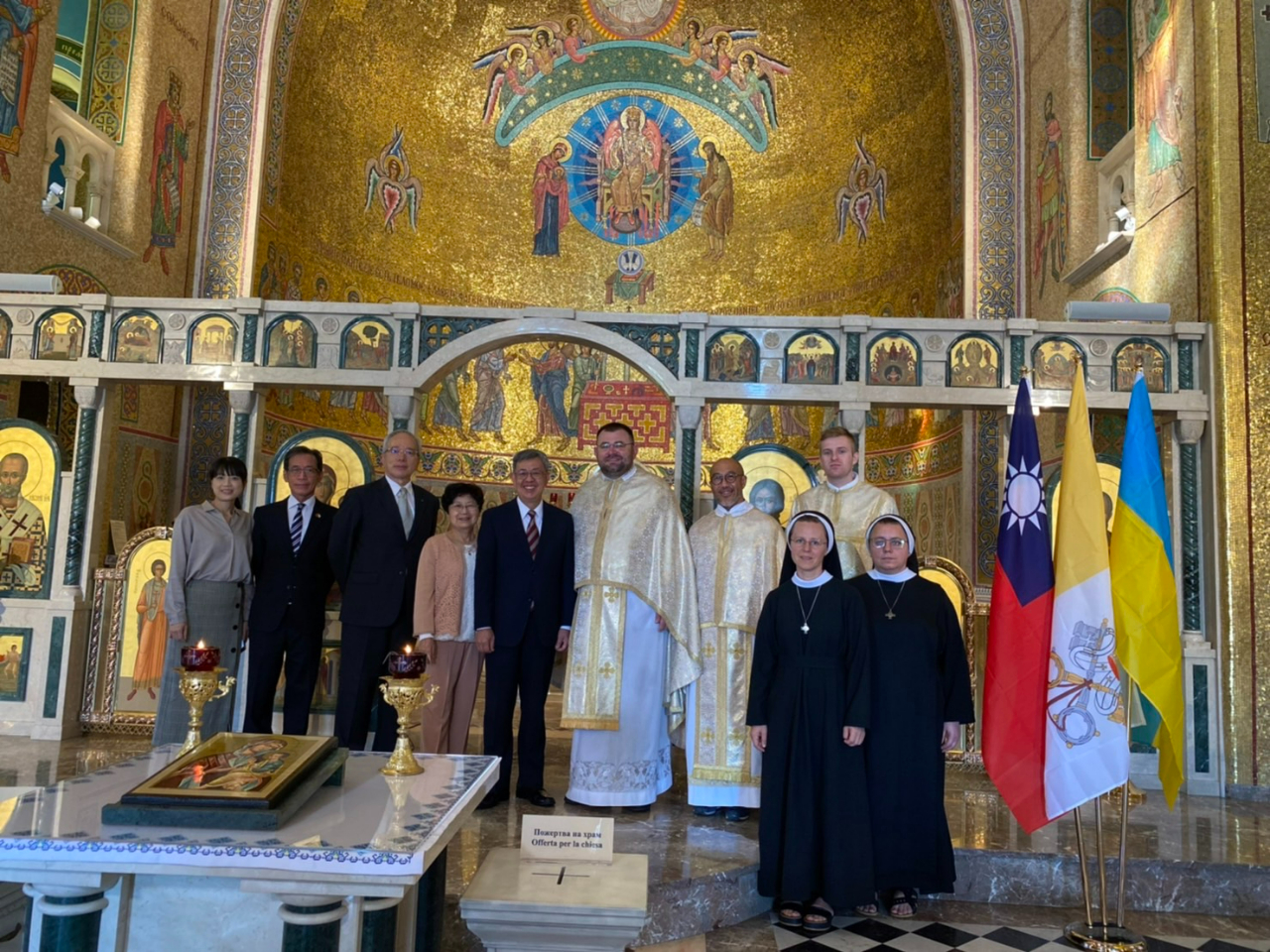 陳建仁昨天出席先教宗若望保祿一世榮列真福品典禮,今天一早應邀前往聖索菲亞大教堂(Basilica di Santa Sofia),參加烏克蘭籍本堂神父沙曼恆( Marco Semehen)主持的「為烏克蘭與世界和平祈福」彌撒,儀式特別以烏克蘭天主教徒慣用的希臘禮進行,旅居羅馬的烏克蘭僑民皆應邀與會。