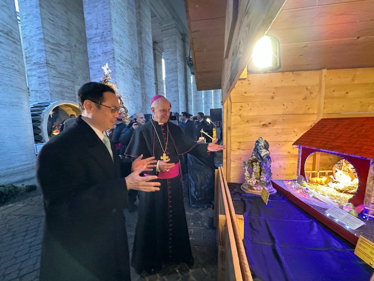開幕剪綵後,賀大使向Fisichella總主教致意,並為他介紹台灣馬槽作品;F總主教興致盎然欣賞我國馬槽作品,並感謝台灣教區始終全力支持旨活動,年年參與之熱情可感。
