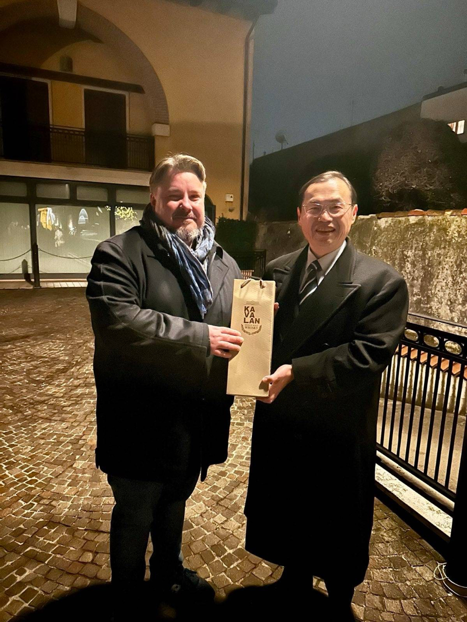 賀大使也與蒙市市長Mr. Roberto Costa會面時,表達甚感榮幸參與蒙市舉辦的慈善活動,並致贈C市長台灣葛瑪蘭威士忌,盼C市長品嚐時想起台灣香醇濃厚的友誼。