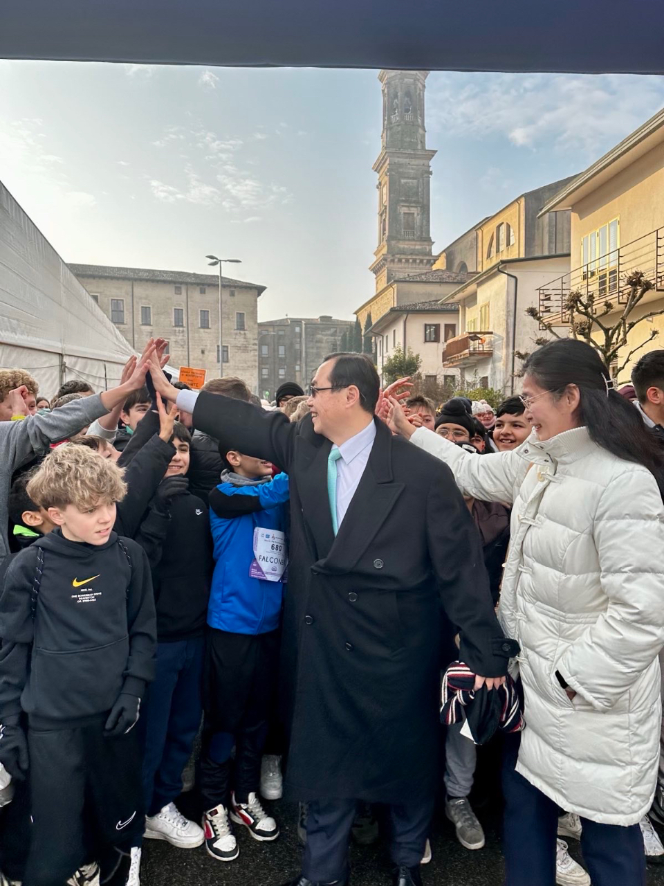 賀大使夫婦於1月16日在蒙市路跑協會(OrganizzazionedellaMontefortiana)主席Mr. Giovanni Pressi、蒙市市政議員Ms. Arianna Tregnaghi及天主教靈醫會傅立吉神父(Fr. Felice Chech)等陪同之下,主持蒙市兒童馬拉松的鳴槍起跑儀式,續參訪主教宮殿 Palazzo Vescovile,及參加「運動,健康與和平之泉源」(Sport, Source of Health and Peace)兒童繪畫比賽頒獎典禮。
