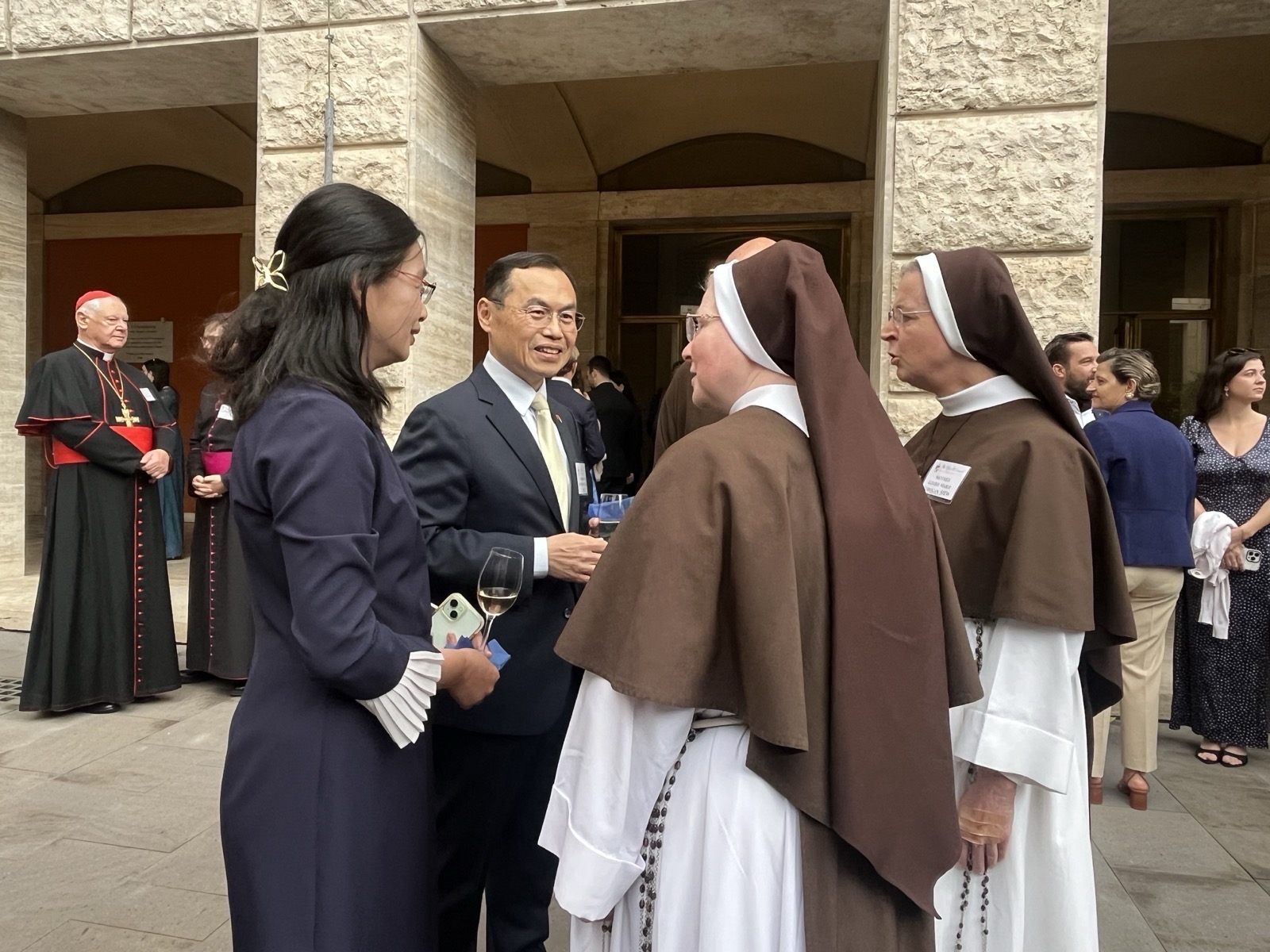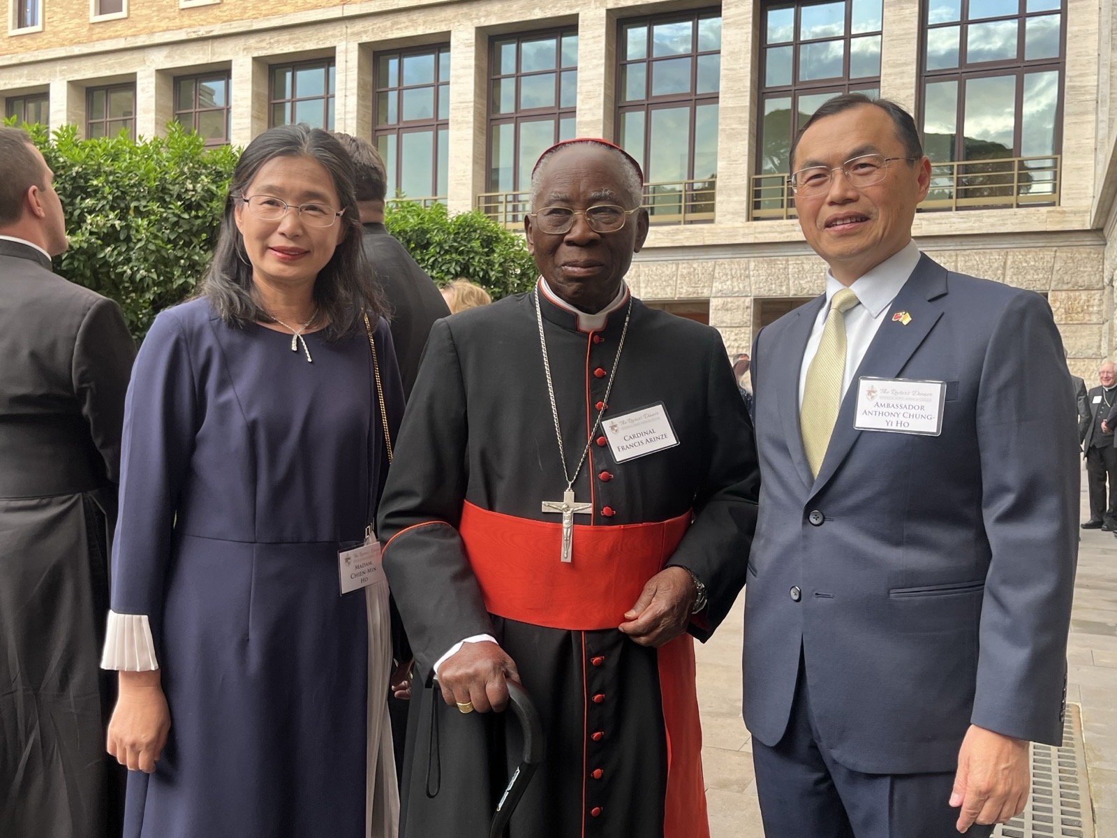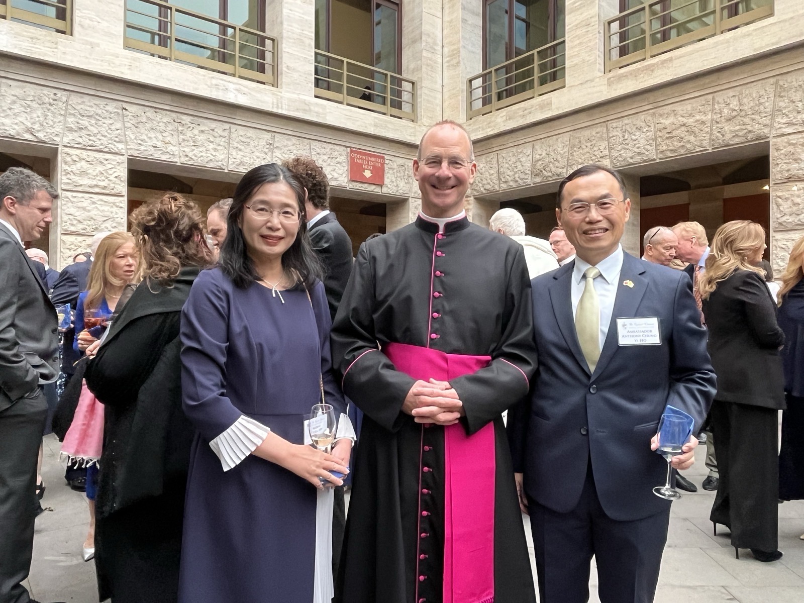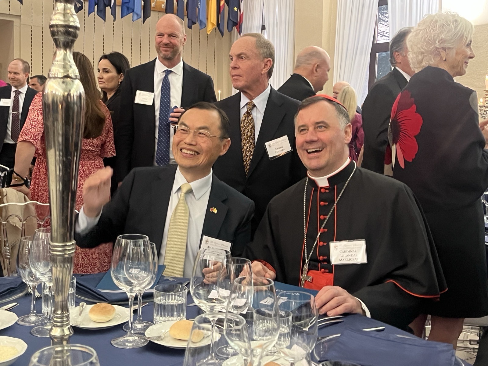 餐會開始前,本館同仁和多位與會人員寒暄致意交談時,宗座北美學院院長Msgr. Thomas W. Powers蒙席特別向賀大使感謝台灣對天主教會的支持,以及本館對該學院的真摯友誼。賀大使夫婦亦與教廷聖事禮儀部前部長Card. Francis Arinze樞機主教、主教部前部長Card. Marc Ouellet樞機主教、最高法院前院長Card. Raymond Leo Burke樞機主教、教義部前部長Card. Gerhard Ludwig Müller樞機主教、美國紐約榮譽總主教Card. Tim Dolan 樞機主教及梵蒂岡城國主席Sr. Raffaella Petrini修女等多位與會賓客握敘寒暄。