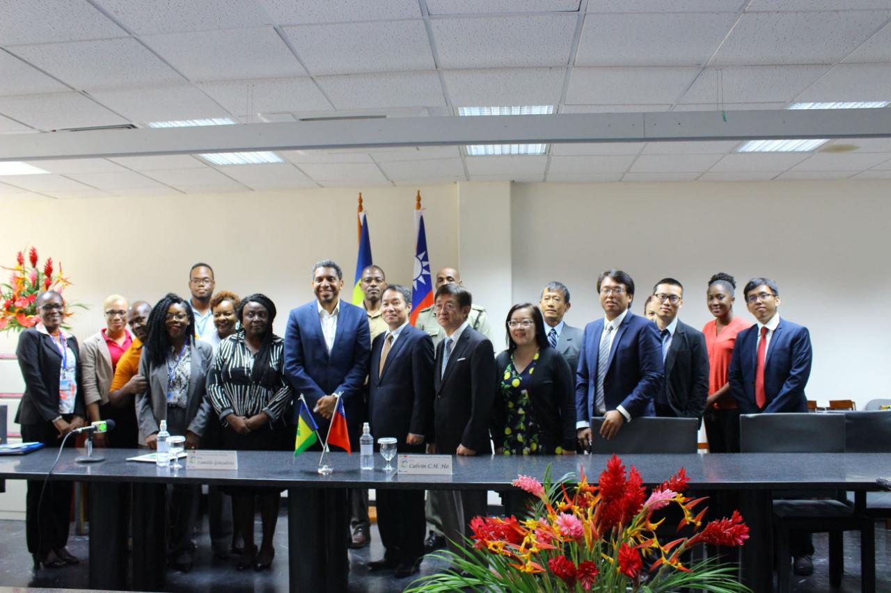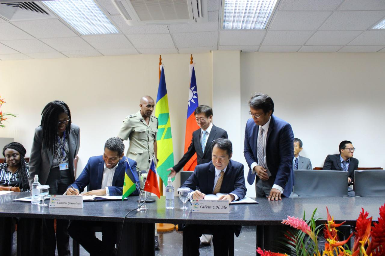 何大使震寰與聖文森財政部長龔沙福在眾人見證下交換協議。