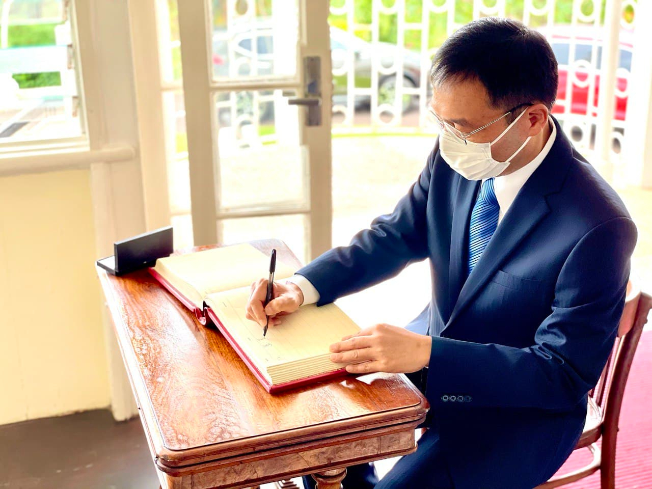 藍大使代表蔡總統向朵根總督、聖國政府及人民致意,並強調兩國建交以來邦誼篤睦,在農業、公衛、科技、教育及基礎建設等各項領域緊密交流,合作成果豐碩;而聖國歷年來亦在國際上積極助我,我國政府及人民至為感謝。藍大使繼表示未來在任內將致力強化兩國互惠互利之緊密夥伴關係,並相信在兩國政府持續深化合作下,定能攜手度過疫情及火山災後復原等各項挑戰。