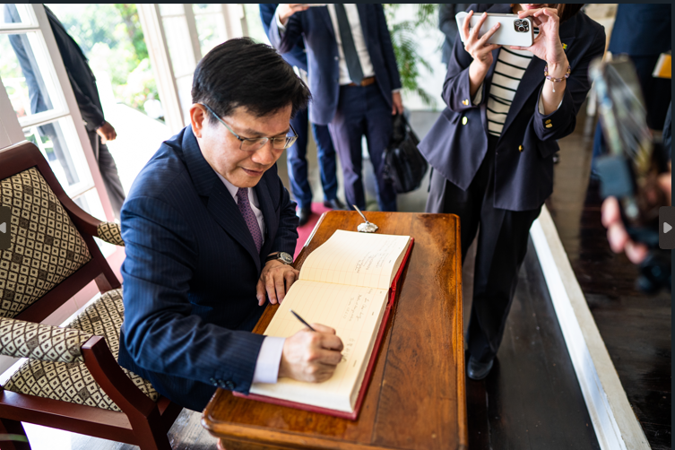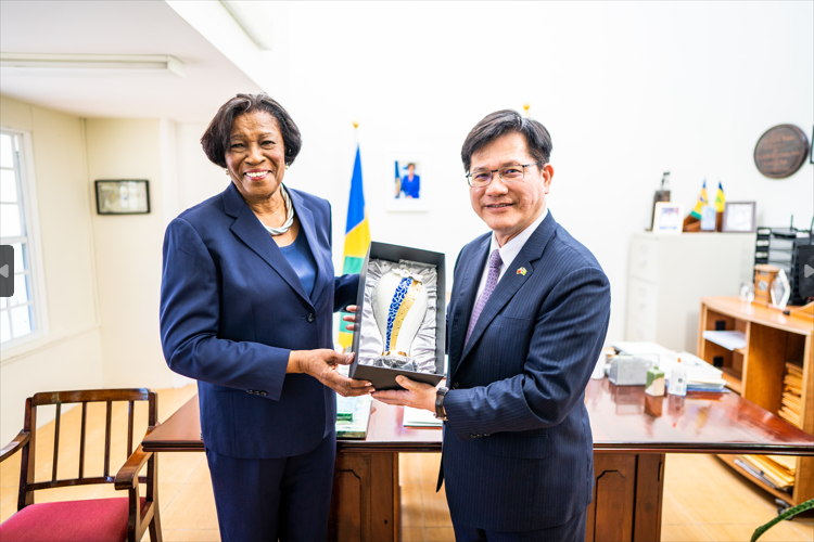 林部長於晉見朵根總督時,親呈特使國書及賴總統致賀聖國獨立45周年函,隨後在總督伉儷的陪同下參觀總督府,在貴賓簽名簿上簽下「台聖邦誼永固!」(R.O.C. (Taiwan) & St. Vincent and Grenadines, Everlasting Friendship!),期許台聖邦誼真摯長遠。林部長盛讚朵根總督主持的「朵根基金會」救助輟學少女,教導她們一技之長,開啟嶄新的人生。