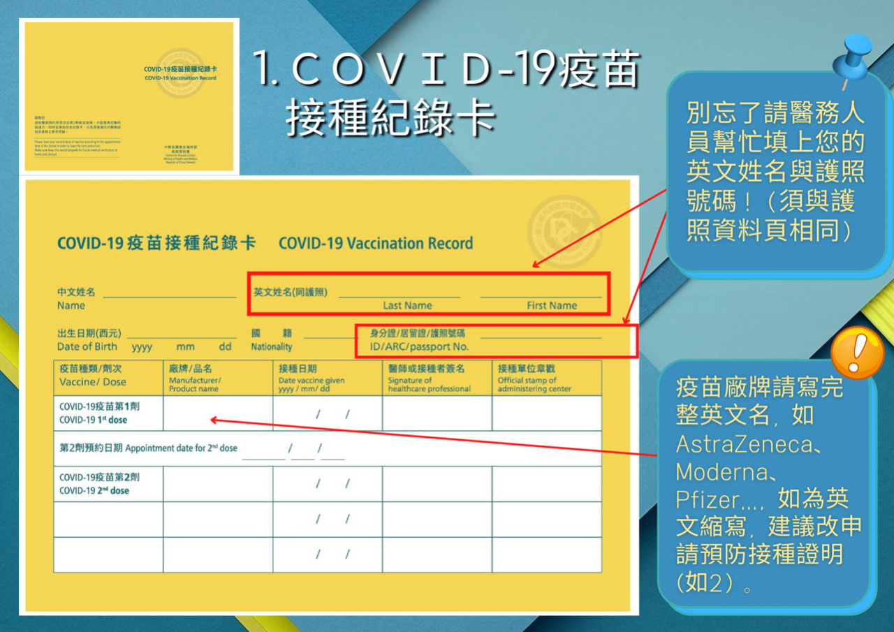 1. 由 COVID-19疫苗接種院所開立之「COVID-19疫苗接種紀錄卡(小黃卡)」,填列完整西元年、護照號碼及同護照之英文姓名。