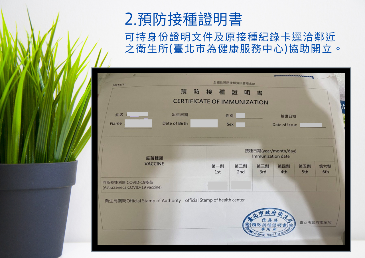依據我國中央流行疫情指揮中心8月5日之說明( https://bit.ly/3z0T3UQ ),我國人可申請之疫苗接種證明有三種: