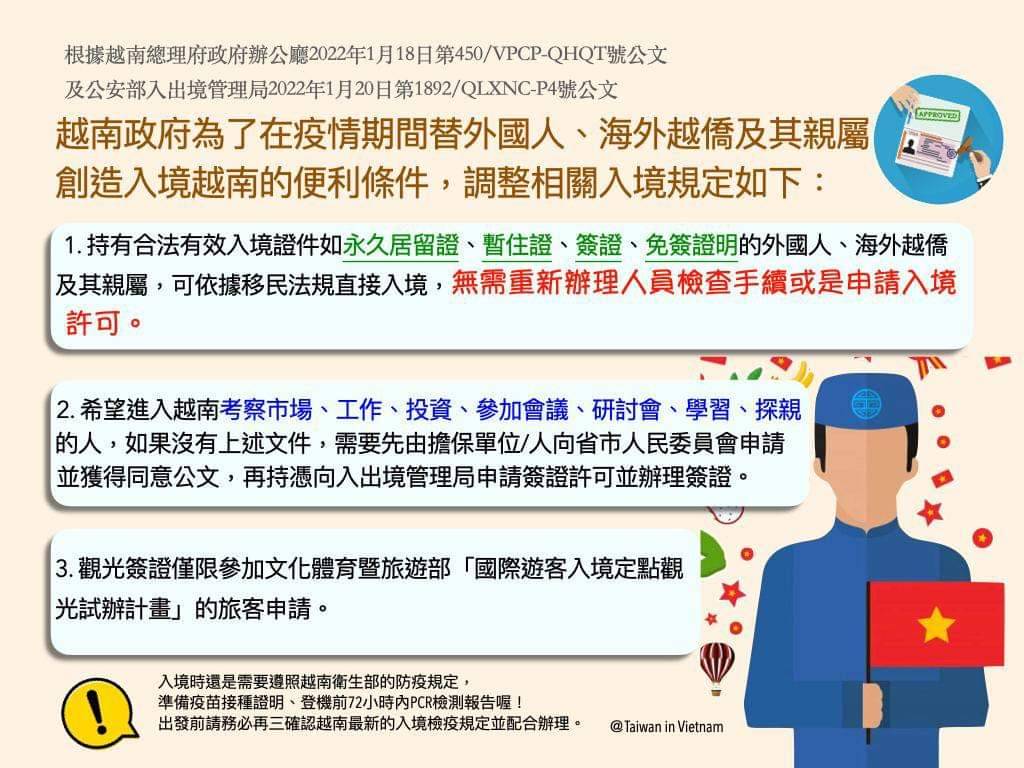 越南總理府政府辦公廳於今(2022)年1月18日頒布第450/VPCP - QHQT號關於「為外國人、海外越僑與其親屬解決入境越南問題」公文( https://www.roc-taiwan.org/vn/post/23809.html ),向中央相關部會傳達范平明副總理同意公安部及外交部建議,放寬疫情期間入境管制措施的決定。
